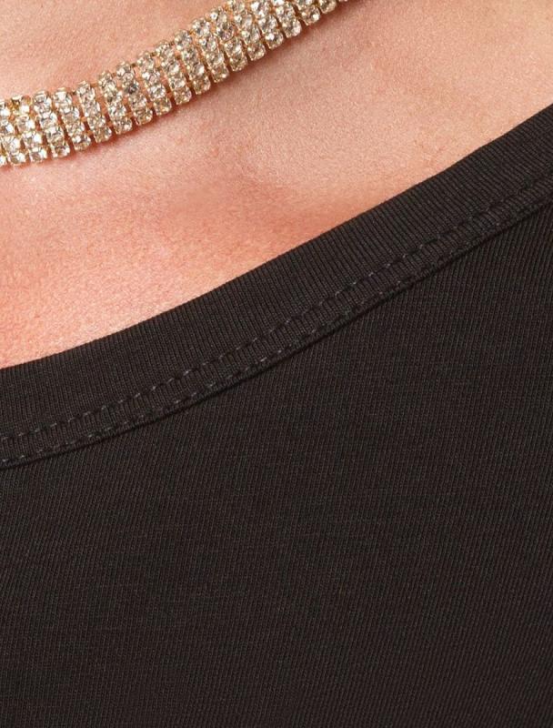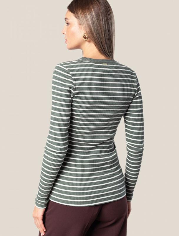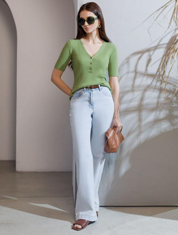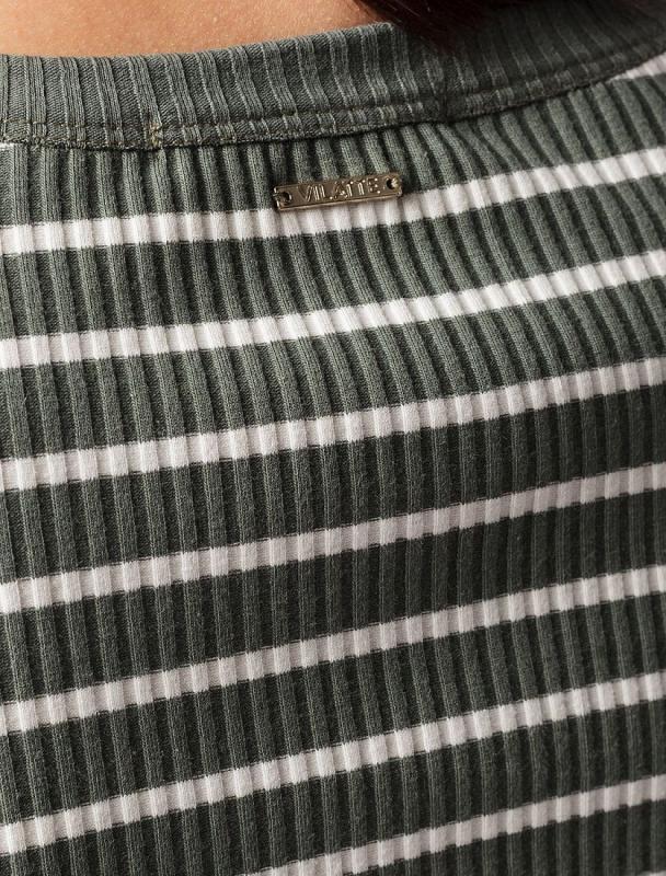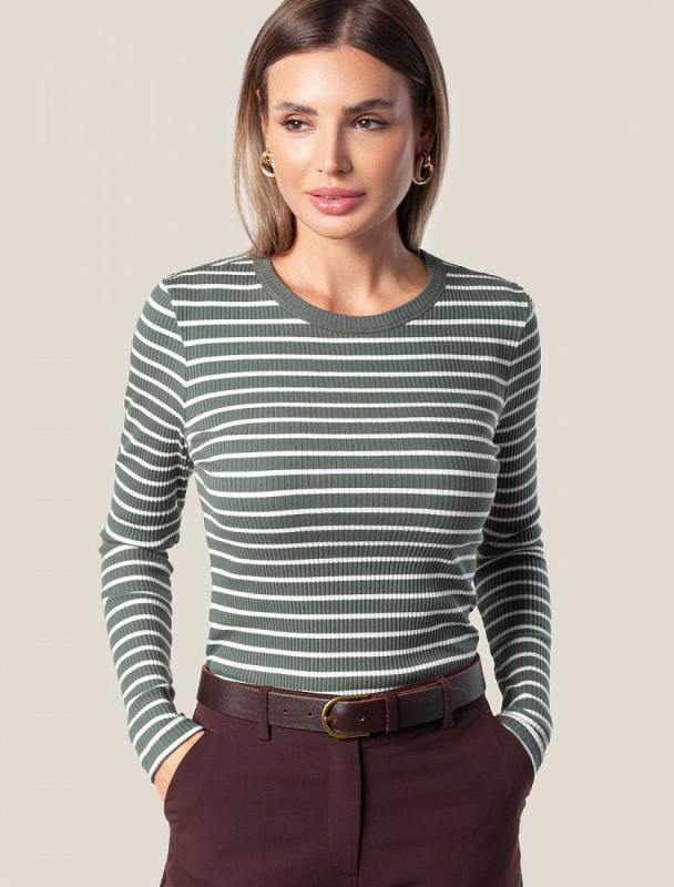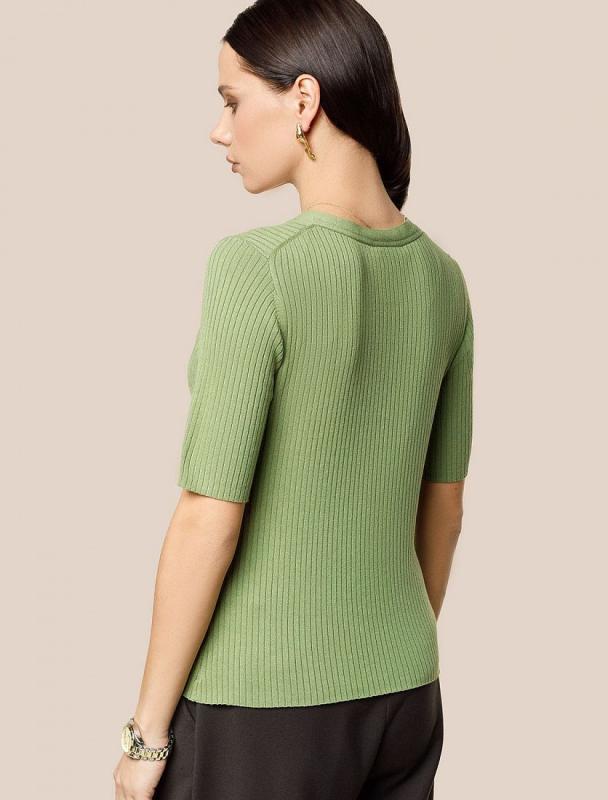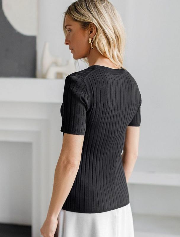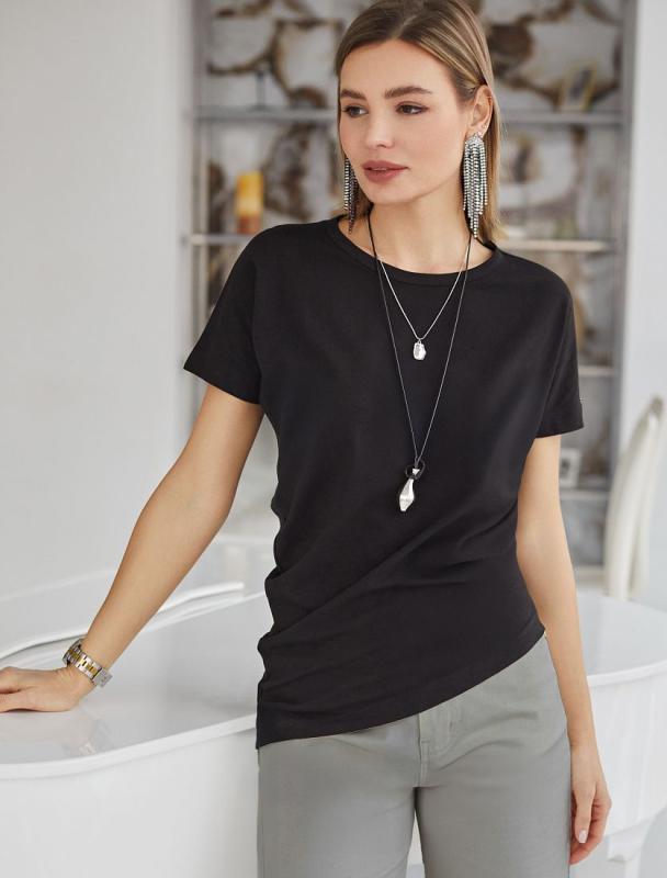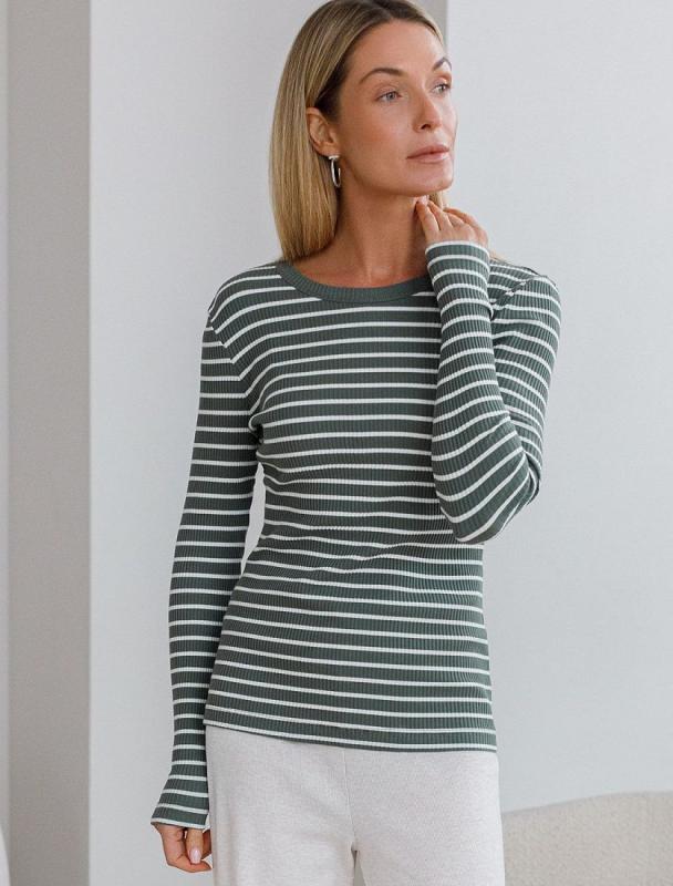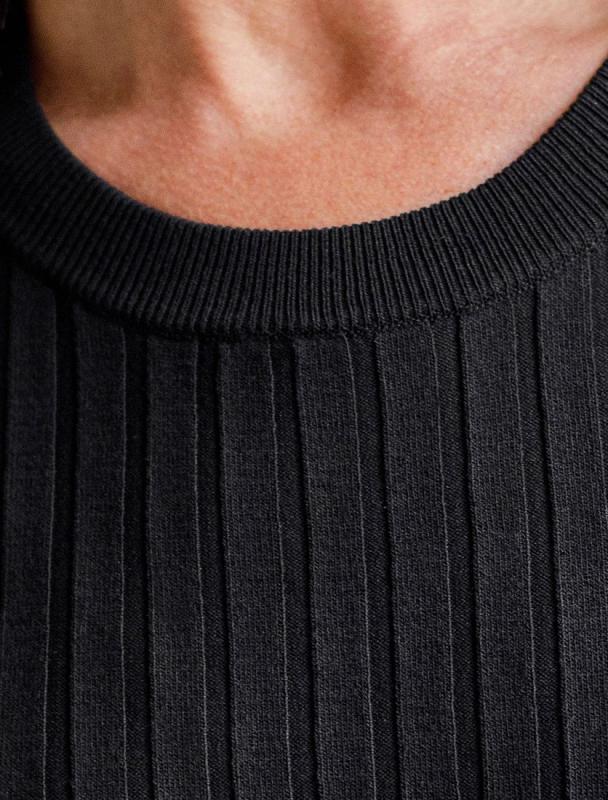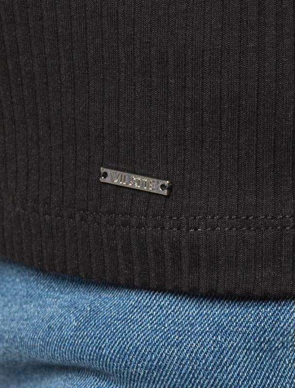 Футболка выполнена из фактурного трикотажа в широкий рубчик. Модель идеально сидит по фигуре не сковывая движения. Хлопковый трикотаж поддерживает оптимальную температуру тела, поэтому в изделии будет комфортно в течении всего дня. Наличие эластана в составе гарантирует формоустойчивости. Базовая модель впишется в любой гардероб.