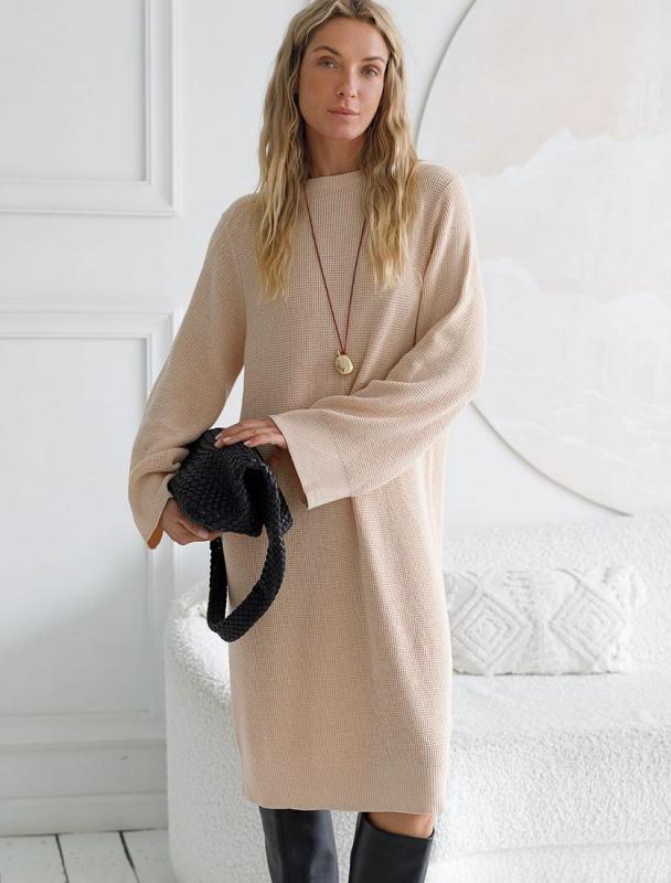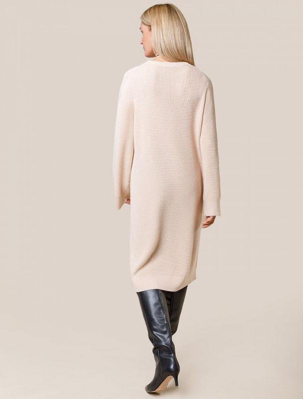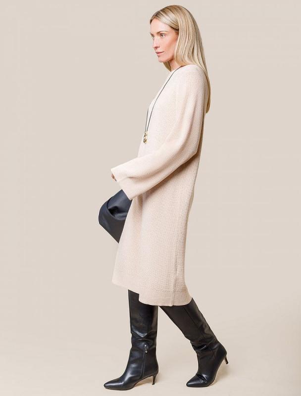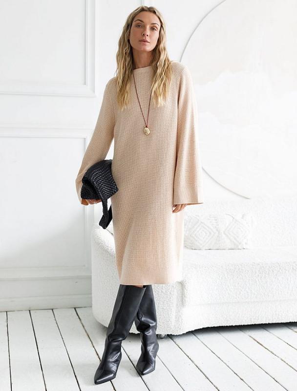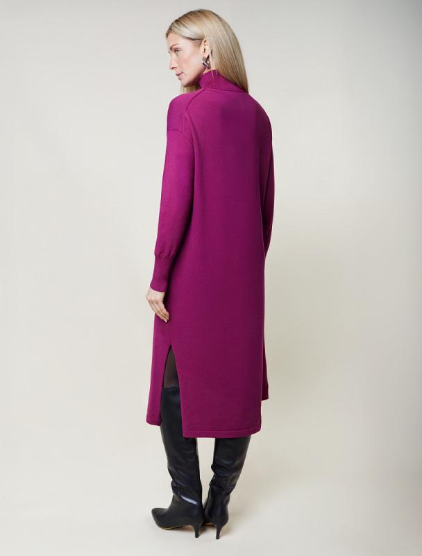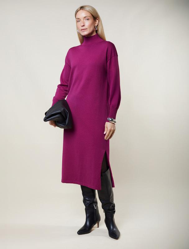 Платье длины миди выполнено из мягкой меланжевой пряжи с кашемиром. Модель прямого силуэта дополнена двумя высокими боковыми разрезами. Вязаный кант вертикально проходящий по всему изделию, визуально стройнит и вытягивает силуэт. При желании можно подчеркнуть линию талии, используя контрастный пояс.