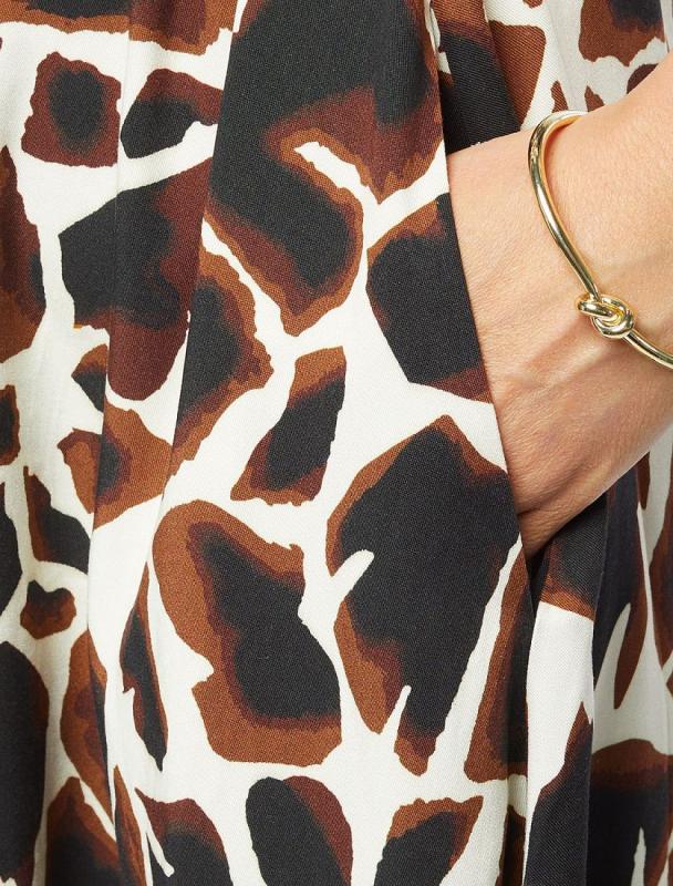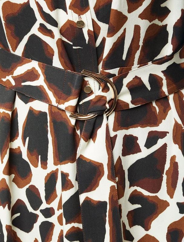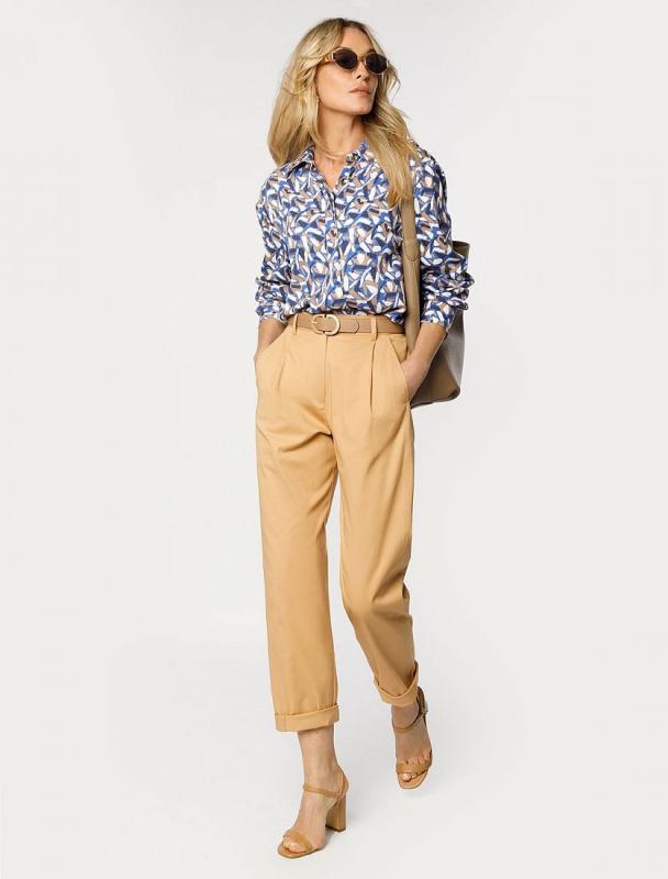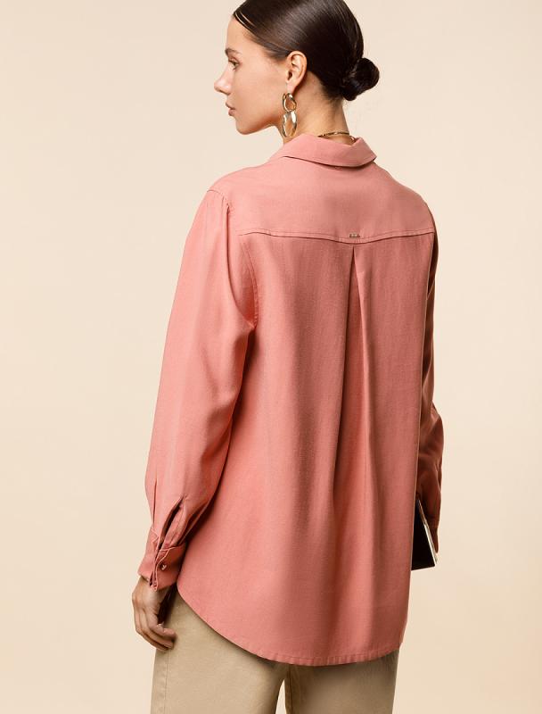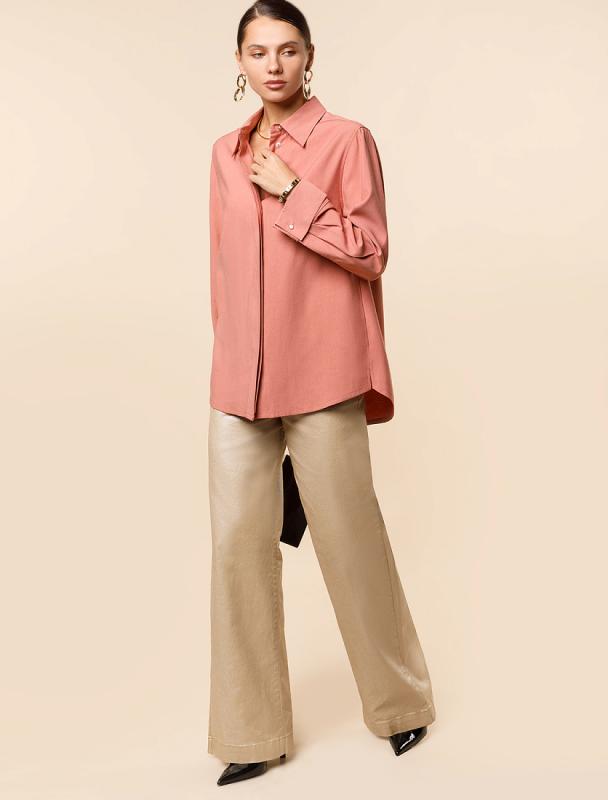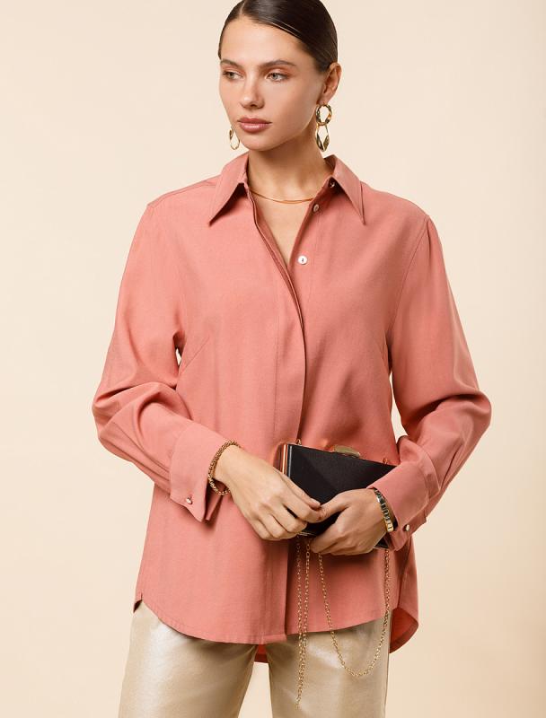 Свободная блузка выполнена из плотного лиоцелла. Модель дополнена золотистыми пуговицами-запонками с эмалью. Основная застежка-планка на потайные пуговицы из натурального перламутра. Добавление синтетических волокон в составе изделия предотвращает сминаемость. На спинке металлический логотип бренда.