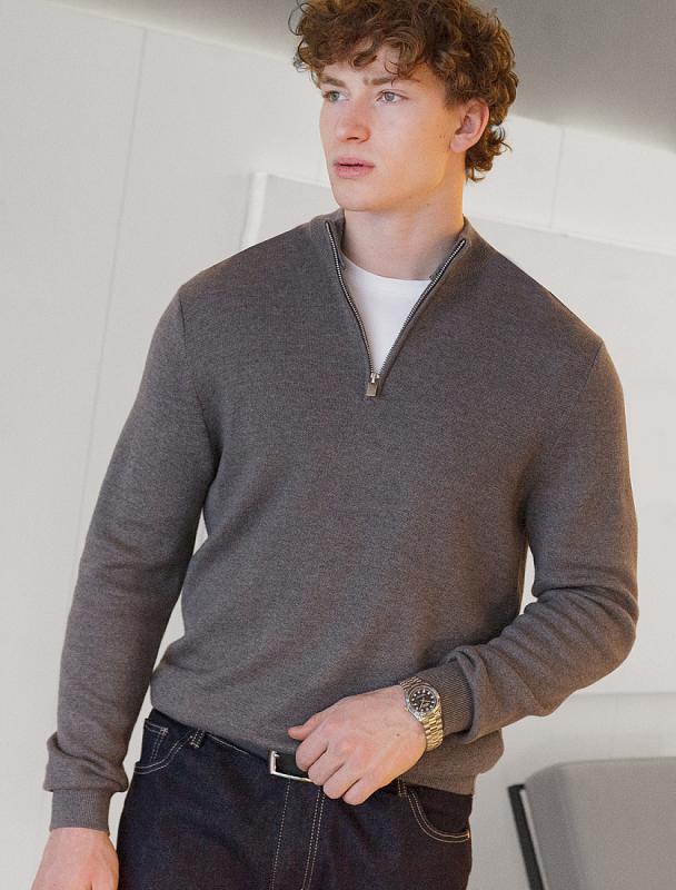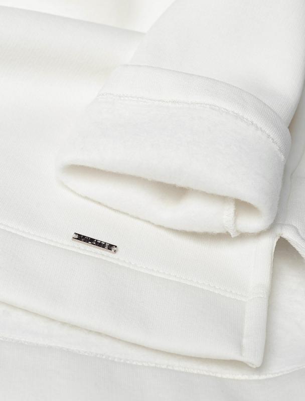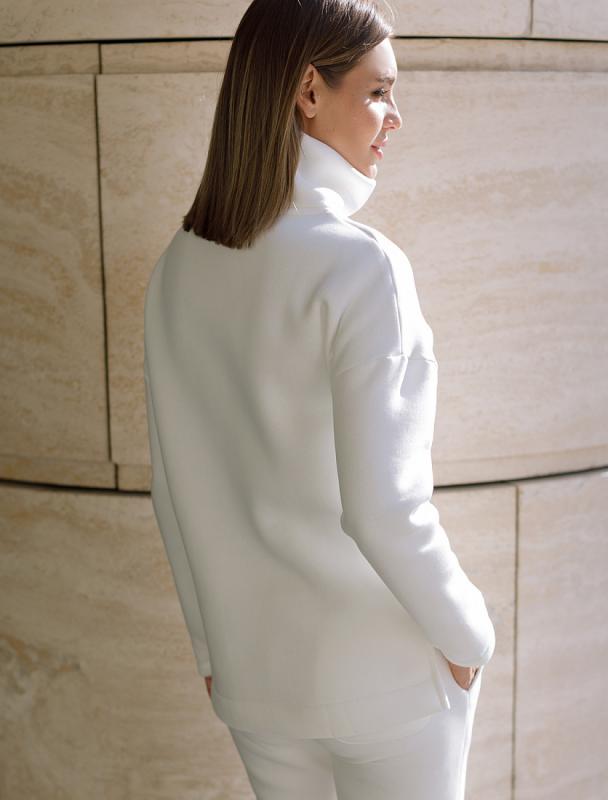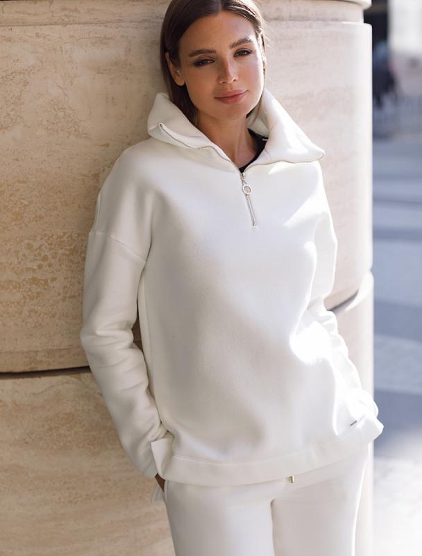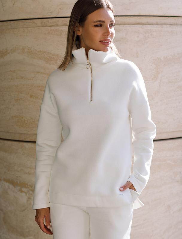 Джемпер среднего объема со спущенным плечом выполнен из футера двухнитки с эластаном. Изделие с воротом на золотистой молнии дополнено боковыми карманами. Эластичный материал гарантирует комфорт и формоустойчивость. Сочетается в костюме с брюками D44.138, D44.139 и шортами D48.008. Изделие дополнено металлическим логотипом бренда.