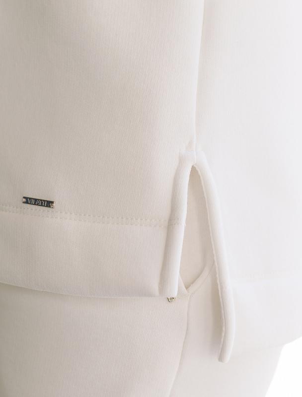Свитшот выполнен из эластичного футера двухнитки. Изделие дополнили лаконичным принтом стразами в тон изделия. Расслабленный стиль поддерживает спущенная линия плеча, свободный силуэт и разрезы по бокам. Модель сочетается в костюме с брюками D44.135, D44.136, D44.137 и юбкой D46.034, D46.036