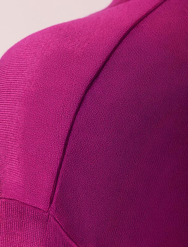 Платье длины мини с воротником поло выполнено из мягкого трикотажа на основе шелковистой эластичной вискозы. Жаккардовое переплетение образует геометрический узор. Застежка на перламутровые пуговицы подчеркивает гладкость пряжи. Контрастный воротник и манжеты делают узор еще более выразительным. Можно сочетать с жакетом D31.388 из жаккардовой коллекции.