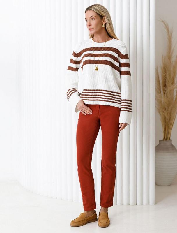 Джемпер выполнен из хлопковой пряжи. Модель украшена контрастными полосами с добавлением мягкого люрекса с деликатным сиянием. Благодаря натуральному составу в изделии будет комфортно в любое время года. Свободный силуэт подходит для любой фигуры.