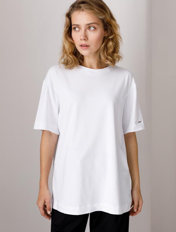 Футболка свободного силуэта выполнена из премиального хлопка.Наличие эластана в составе изделия позволит сохранить безупречный внешний вид в течение долгого времени. Логотип бренда в виде нашивки на рукаве выполнен из экокожи.