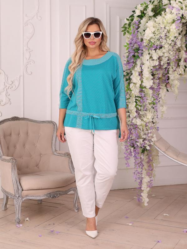 Великолепный джемпер свободного силуэта из трикотажного полотна голубого цвета. Фигурный вырез изделия обработан внешней обтачкой . Джемпер с цельнокроеными рукавами. Линия бедра эффектно подчеркнута кулиской. В боковых швах разрезы. Спинка изделия немного длиннее переда. Аксессуары в комплект не входят. Длина изделия по спинке от плечевого шва до низа изделия — 70 см. Рост модели — 170 см.
