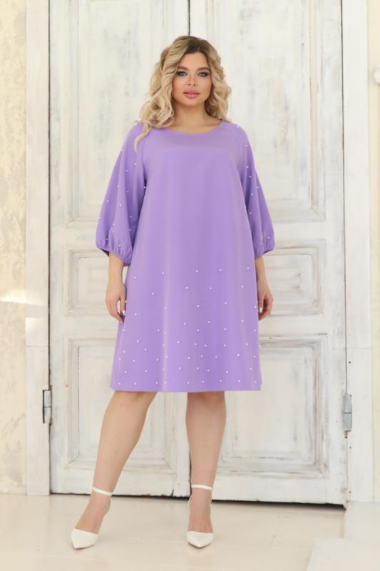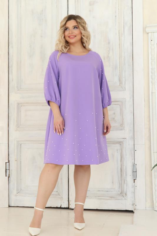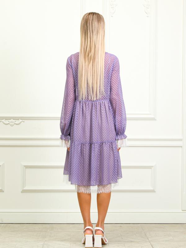 Нежное платье А-силуэта из текстильной ткани сиреневого цвета. Круглый вырез обработан окантовкой, платье с втачными рукавами, по бокам изделия - внутренние карманы. Длина изделия по спинке от плечевого шва до низа изделия — 102 см. Рост фотомодели — 170 см.