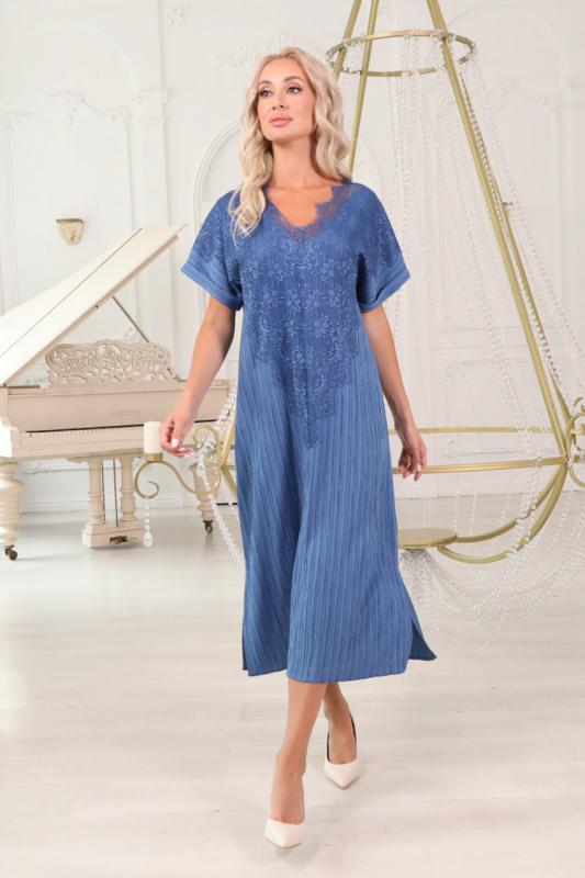 Стильное платье полуприлегающего силуэта из текстильной ткани голубого цвета. V-образный вырез эффектно подчеркнут кружевом. Платье с цельнокроеными рукавами. Перед изделия дополнен кружевом. Длина изделия по спинке от плечевого шва до низа изделия — 119 см. Рост фотомодели — 170 см.
