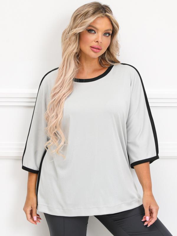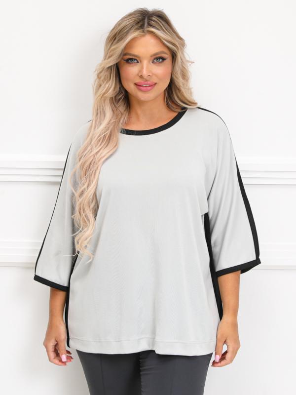 Уютный джемпер прямого силуэта из трикотажного полотна серого цвета. Джемпер дополнен контрастными окантовками. Круглый вырез изделия обработан окантовкой. Джемпер с цельнокроеными рукавами. Длина изделия по спинке от плечевого шва до низа изделия — см. Рост фотомодели — 170 см.