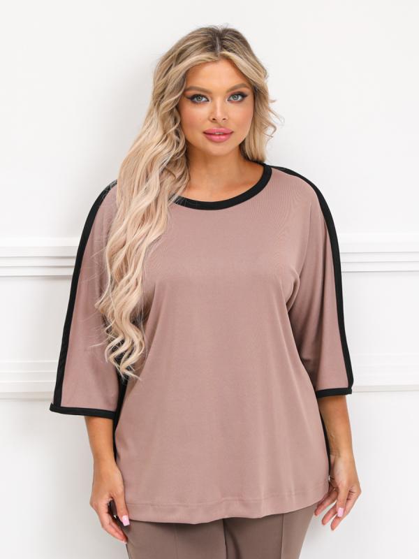 Уютный джемпер прямого силуэта из трикотажного полотна кофейного цвета. Джемпер дополнен контрастными окантовками. Круглый вырез изделия обработан окантовкой. Джемпер с цельнокроеными рукавами. Длина изделия по спинке от плечевого шва до низа изделия — см. Рост фотомодели — 170 см.