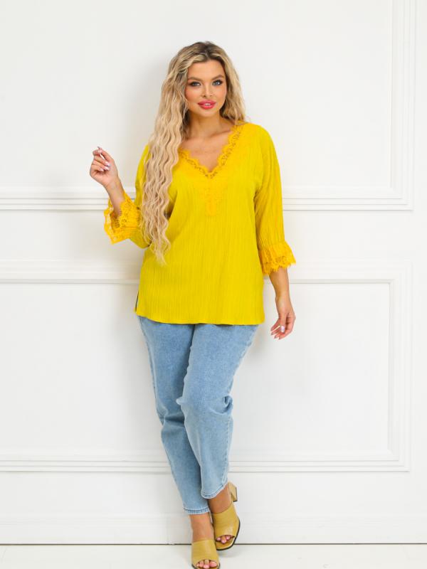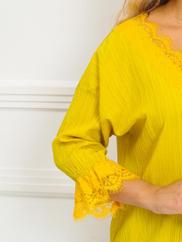 Эффектная блузка прямого силуэта из текстильной ткани желтого цвета. V-образный вырез эффектно подчеркнут кружевом. Блузка со спущенной проймой, втачные рукава дополнены сборкой и кружевом. Длина изделия по спинке от плечевого шва до низа изделия - см. Рост фотомодели — 170 см.