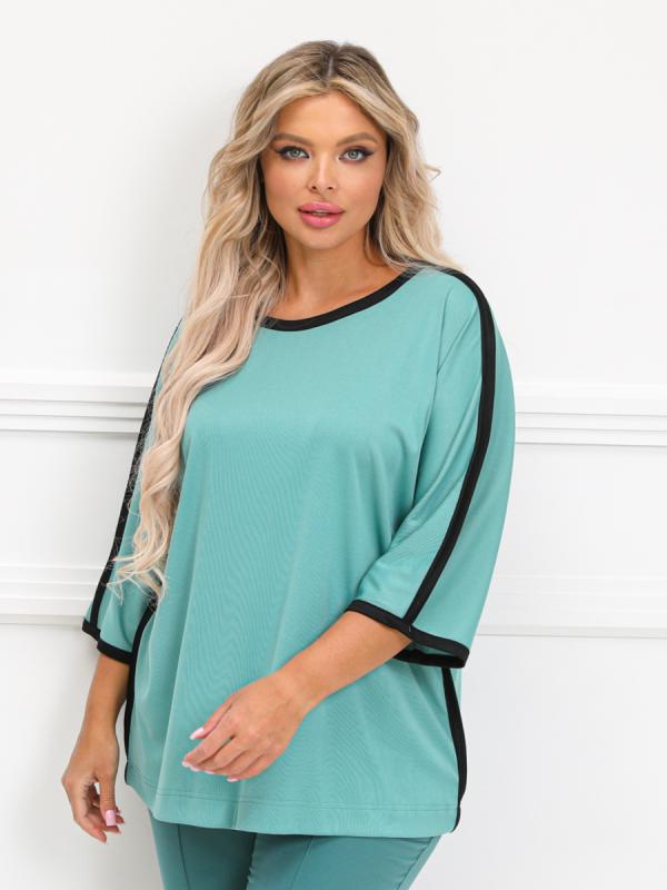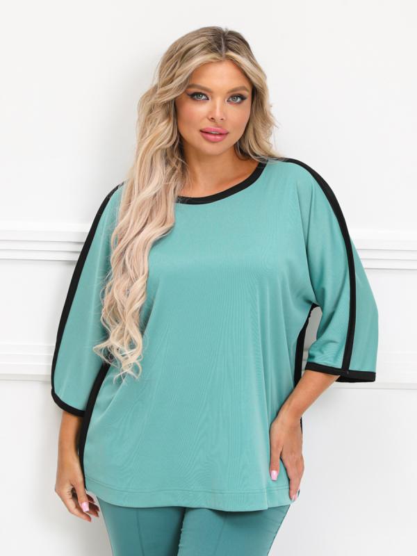 Уютный джемпер полуприлегающего силуэта из трикотажного полотна мятного цвета. Джемпер дополнен контрастными окантовками. Круглый вырез изделия обработан окантовкой. Джемпер с цельнокроеными рукавами. Длина изделия по спинке от плечевого шва до низа изделия — см. Рост фотомодели — 170 см.