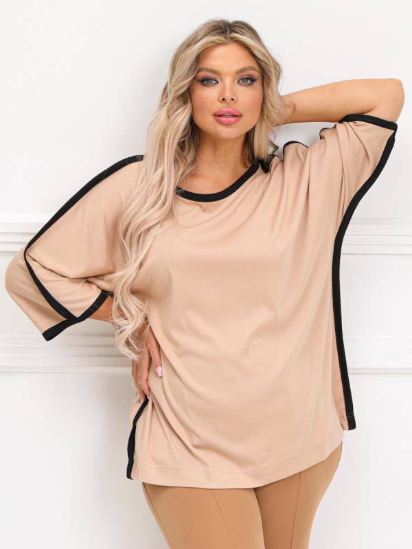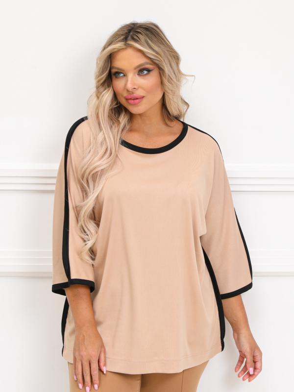 Уютный джемпер прямого силуэта из трикотажного полотна бежевого цвета. Джемпер дополнен контрастными окантовками. Круглый вырез изделия обработан окантовкой. Джемпер с цельнокроеными рукавами. Длина изделия по спинке от плечевого шва до низа изделия — см. Рост фотомодели — 170 см.