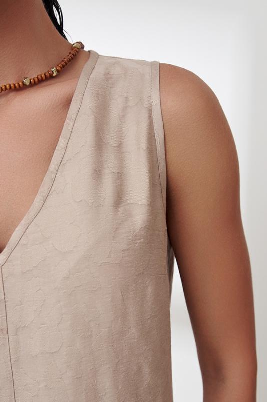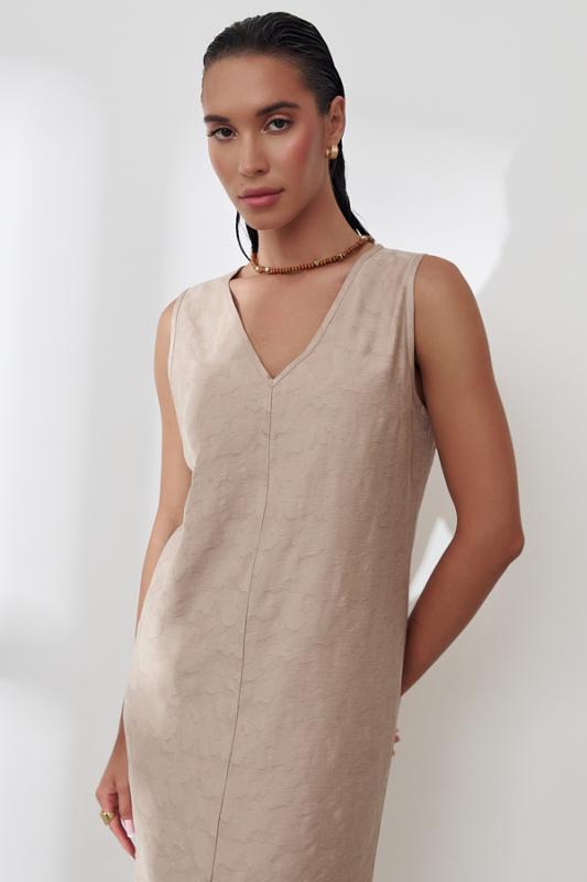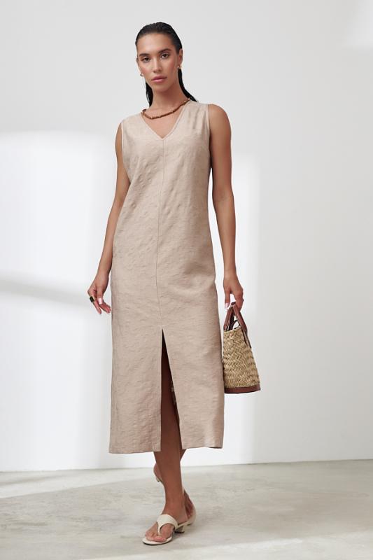 Платье из фактурной вискозной ткани полуприлегающего силуэта. По центру передней части изделия выполнен шов, снизу разрез. V-образный вырез горловины и линия проймы оформлены косыми бейками.