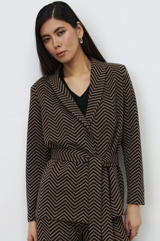 Костюм из эластичного полотна. Брюки прямого силуэта. Пояс с эластичной резиной. Жакет прямого свободного кроя с женственным шалевым воротником. На передней части изделия накладные карманы. Втачной рукав. В комплекте пояс из основной ткани, позволяющий создавать приталенный силуэт. Изделие с плечевыми накладками, которые при желании можно убрать.