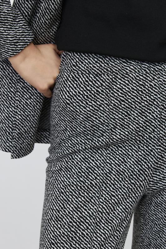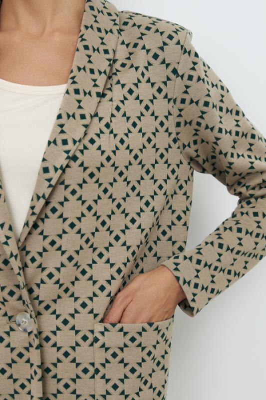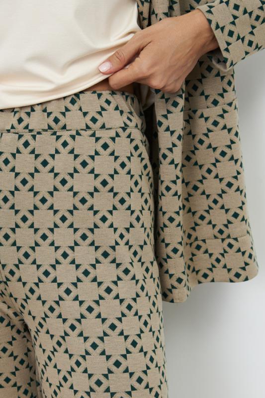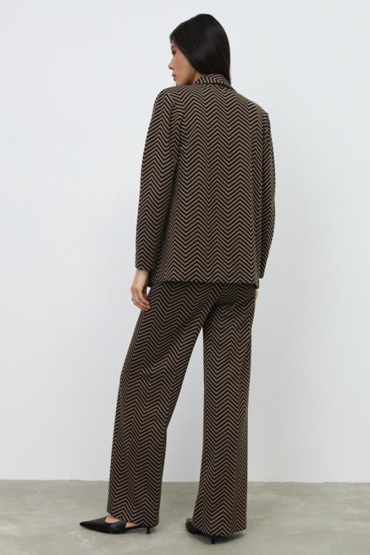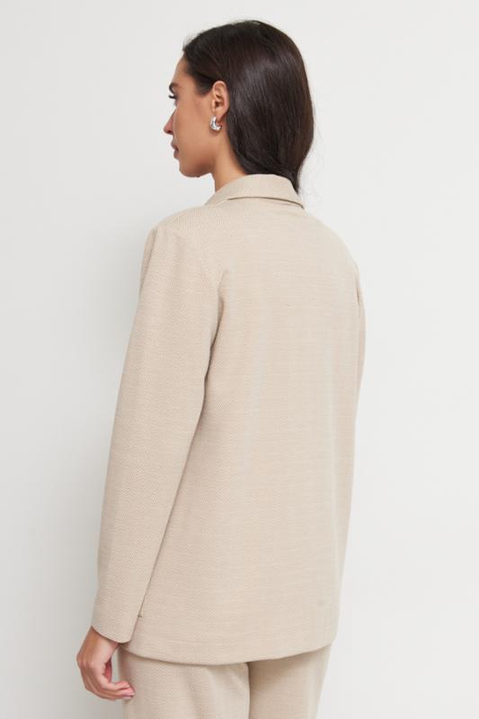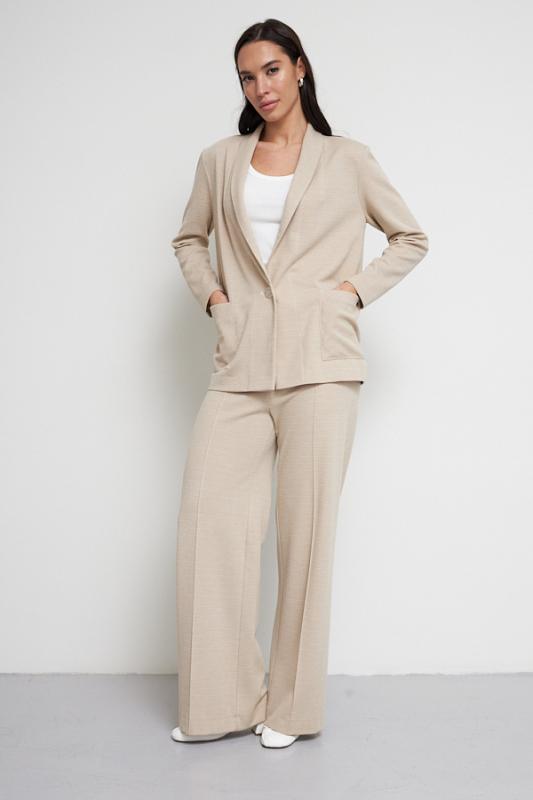 Костюм из эластичного полотна. Брюки прямого силуэта. Пояс с эластичной резиной. Жакет прямого свободного кроя с женственным шалевым воротником. На передней части изделия застёжка на пуговицу и накладные карманы. Втачной рукав. Изделие с плечевыми накладками, которые при желании можно убрать.