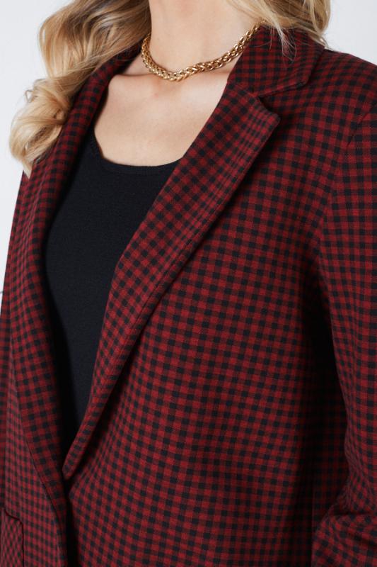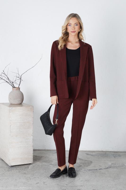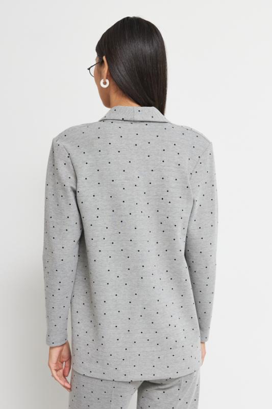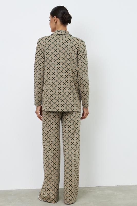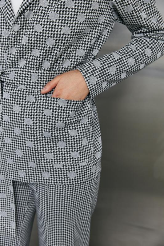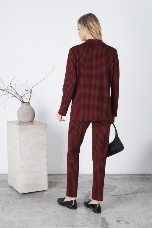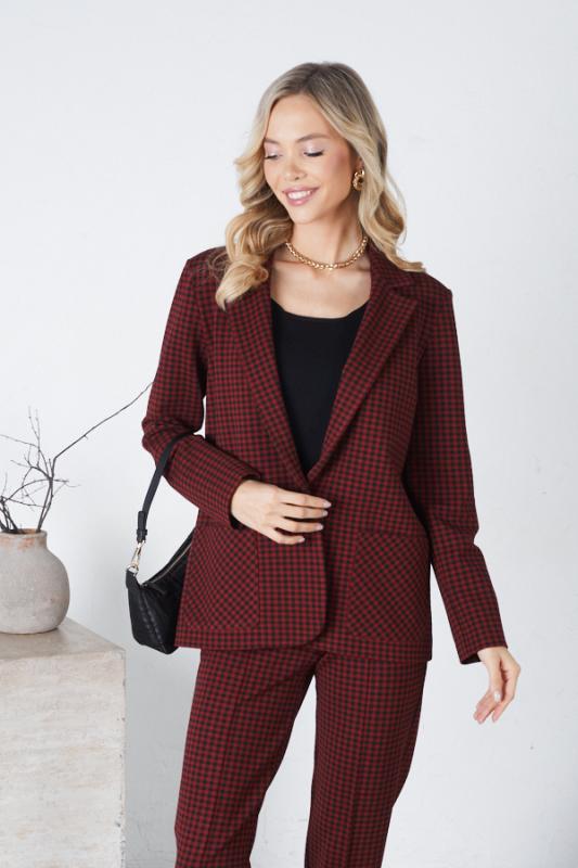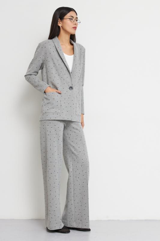Костюм выполнен из эластичного полотна. Брюки прямого силуэта. На передней части брюк застрочены стрелки. Пояс с эластичной резиной. Жакет прямого силуэта с английским воротником и накладными карманами. На передней части жакета застежка на пуговицу. Втачной длинный рукав. Изделие с плечевыми накладками, которые при желании можно убрать.