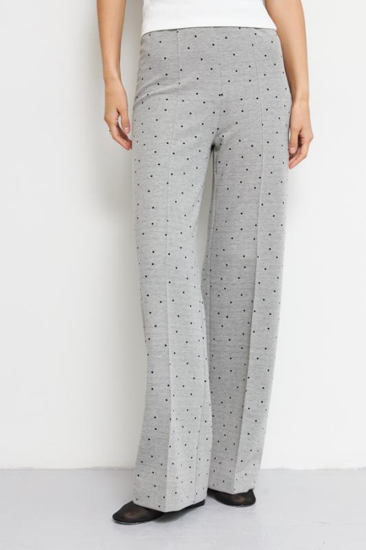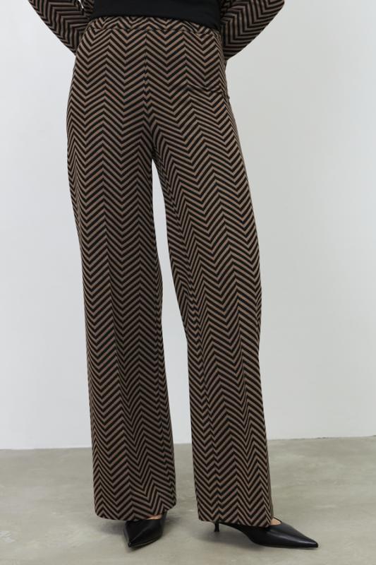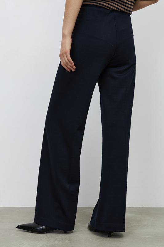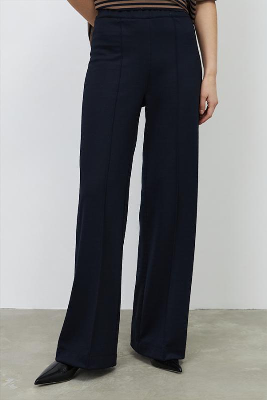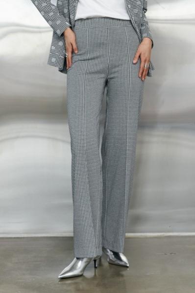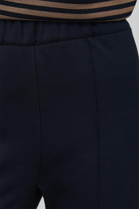 Брюки прямого силуэта из эластичного полотна, с покрытием, имитирующим кожу. По центру передней части брючин выполнен шов с декоративной строчкой. Пояс с эластичной резиной.