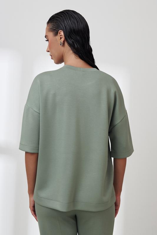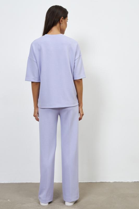 Костюм из эластичного полотна. Джемпер свободного силуэта со спущенной линией плеча и рукавом до локтя. Вырез горловины оформлен бейкой из основной ткани. Брюки прямого силуэта. Пояс притачной с эластичной резиной. На передней части брюк застрочены стрелки.