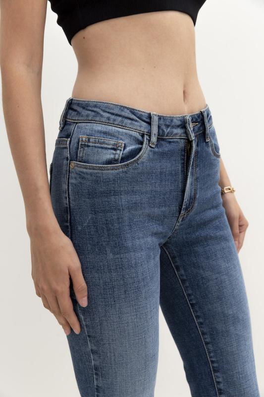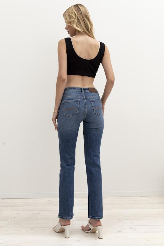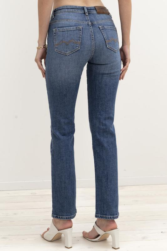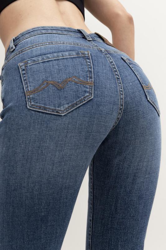 Брюки из эластичного денима, выполнены по классической джинсовой технологии (варка с эффектом легкого выбеливания). Крой классический прямой, слегка зауженный книзу. На задней части брюк выполнены накладные карманы, на передней- карманы с подкройным бочком. Притачной пояс со шлёвками. Застёжка на молнию-гульфик и пуговицу.