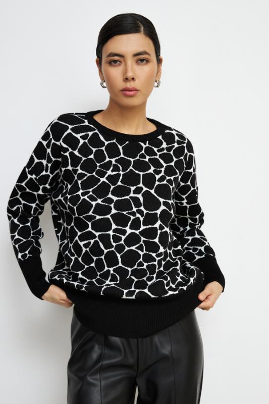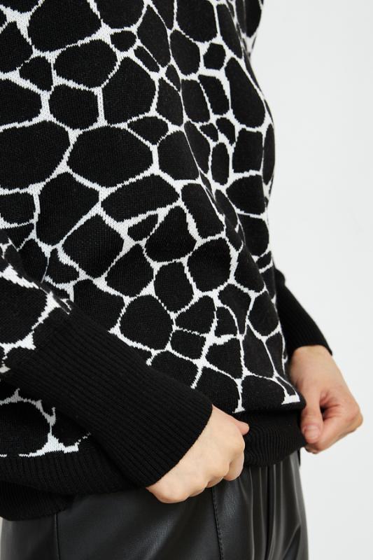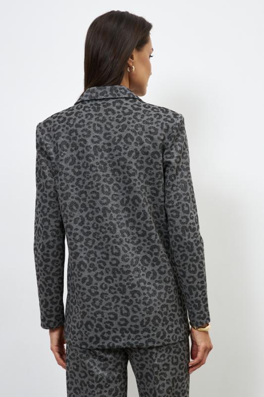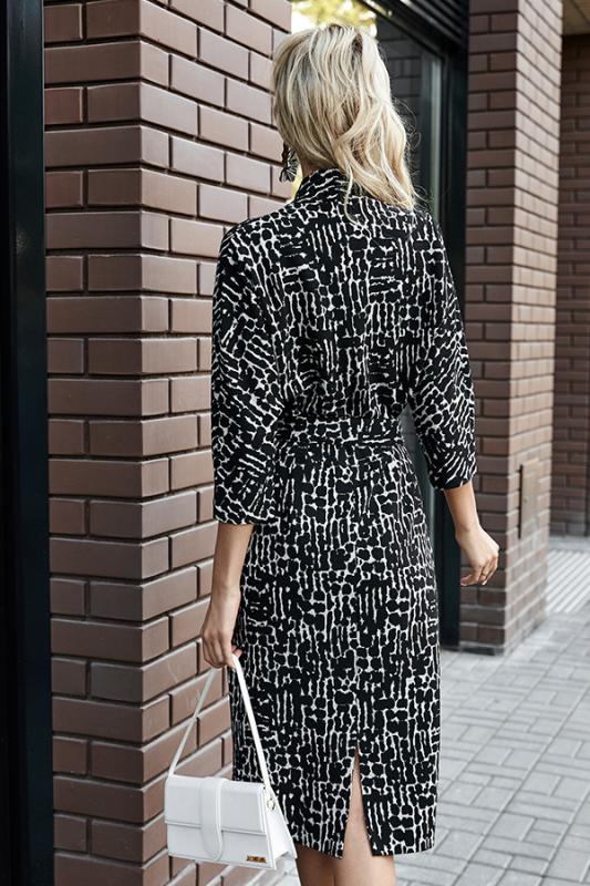 Платье полуприлегающего силуэта из эластичного полотна с жаккардовым анималистичным узором. Втачной длинный рукав. Воротник-стойка с отворотом.