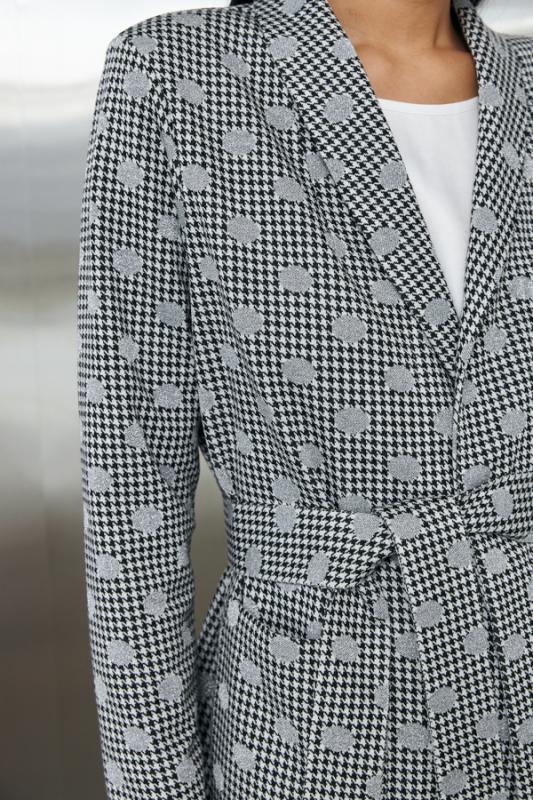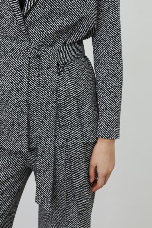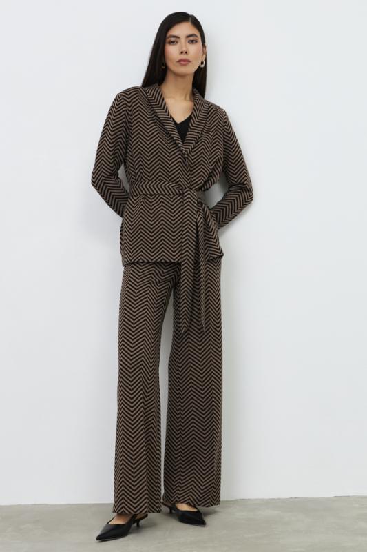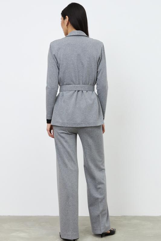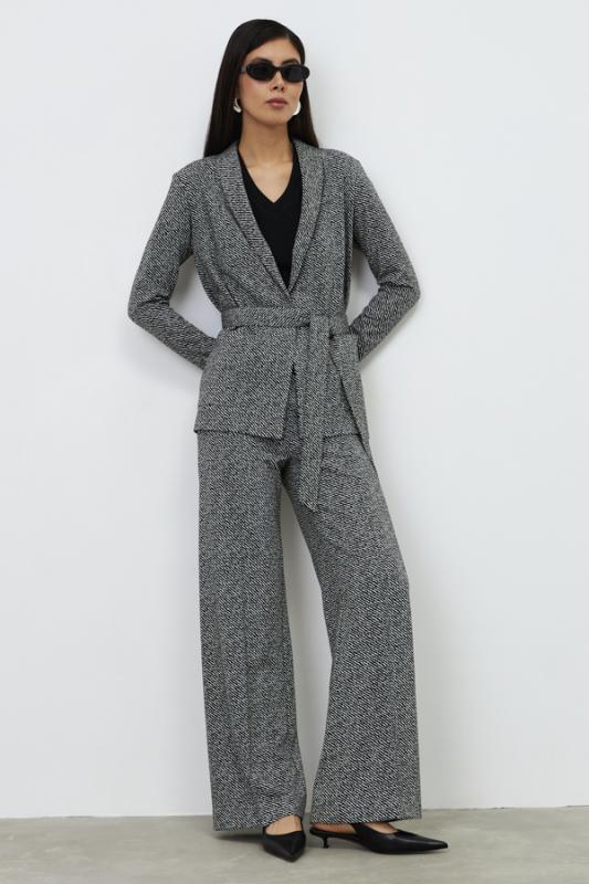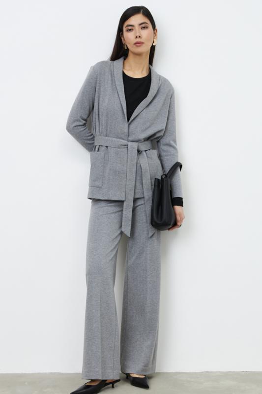Костюм из эластичного полотна. Брюки прямого силуэта. Пояс с эластичной резиной. Жакет прямого свободного кроя с женственным шалевым воротником. Втачной рукав. В комплекте пояс из основной ткани, позволяющий создавать приталенный силуэт. Изделие с плечевыми накладками, которые при желании можно убрать.