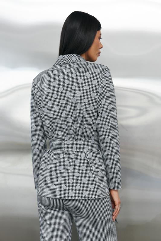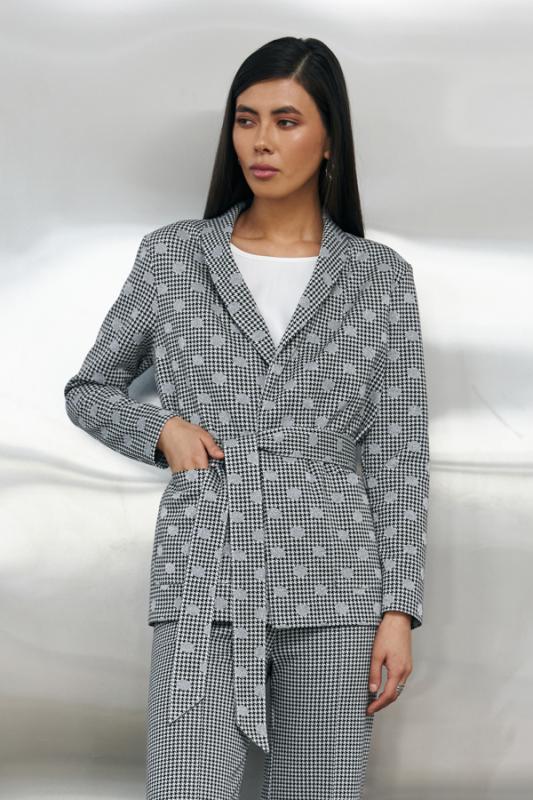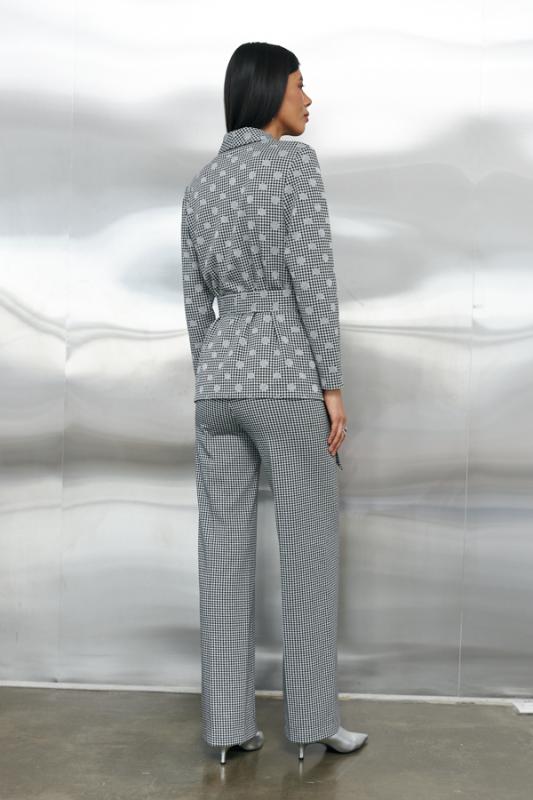 Костюм выполнен из эластичных тканей компаньонов. Брюки прямого силуэта. Пояс притачной с эластичной резиной. На передней части брюк застрочены стрелки. Жакет прямого свободного кроя с женственным шалевым воротником. На передней части изделия накладные карманы. Втачной рукав. Изделие с плечевыми накладками, которые при желании можно убрать. В комплекте пояс из основной ткани.
