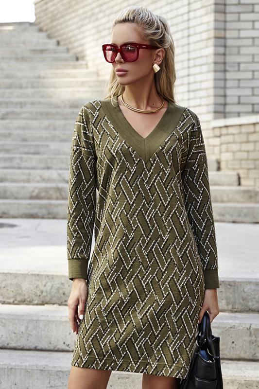 Платье свободного силуэта из фактурного эластичного полотна. V-образный вырез горловины обработан притачной планкой. Втачной длинный рукав в спущенную пройму с манжетой.