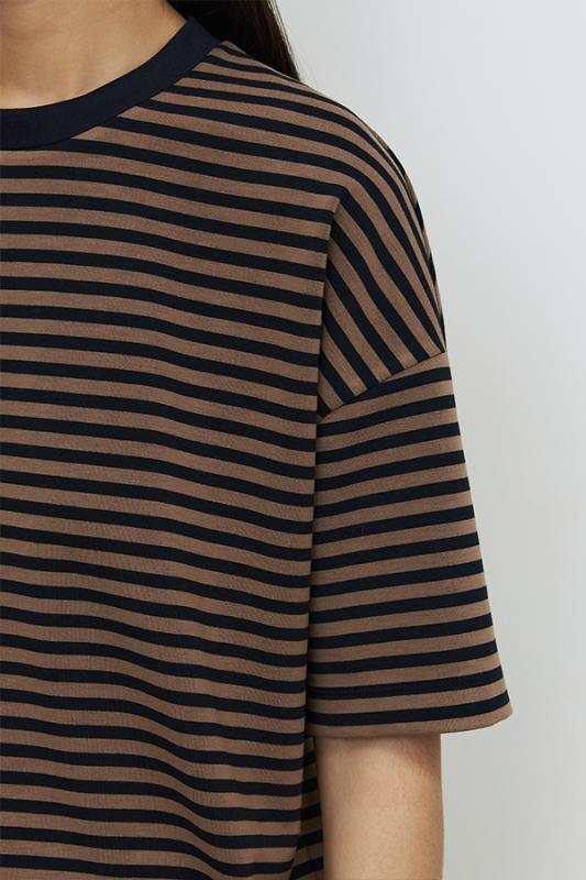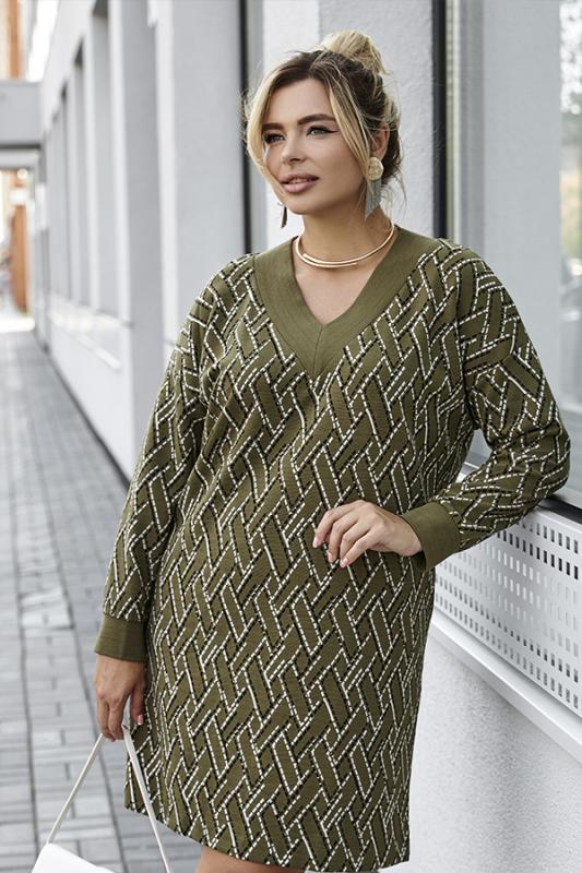 Платье свободного силуэта из фактурного эластичного полотна. V-образный вырез горловины обработан притачной планкой. Втачной длинный рукав в спущенную пройму с манжетой. Манжет рукава и планка выполнены из ткани-компаньона.