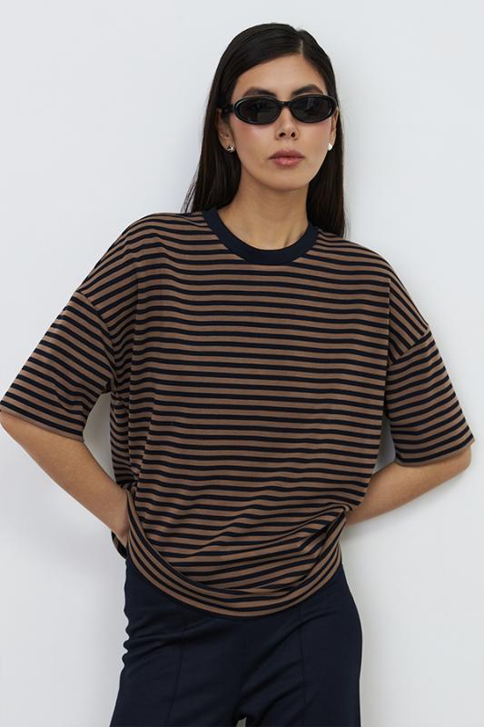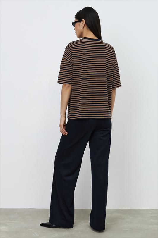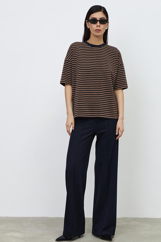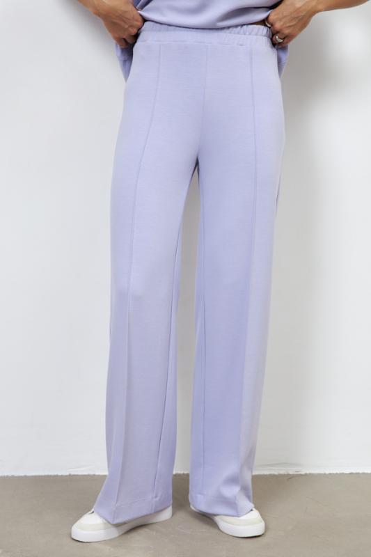 Костюм из эластичного полотна. Джемпер свободного силуэта со спущенной линией плеча и рукавом до локтя. Вырез горловины оформлен бейкой из основной ткани. Брюки прямого силуэта. Пояс с эластичной резиной. На передней части брюк застрочены стрелки.