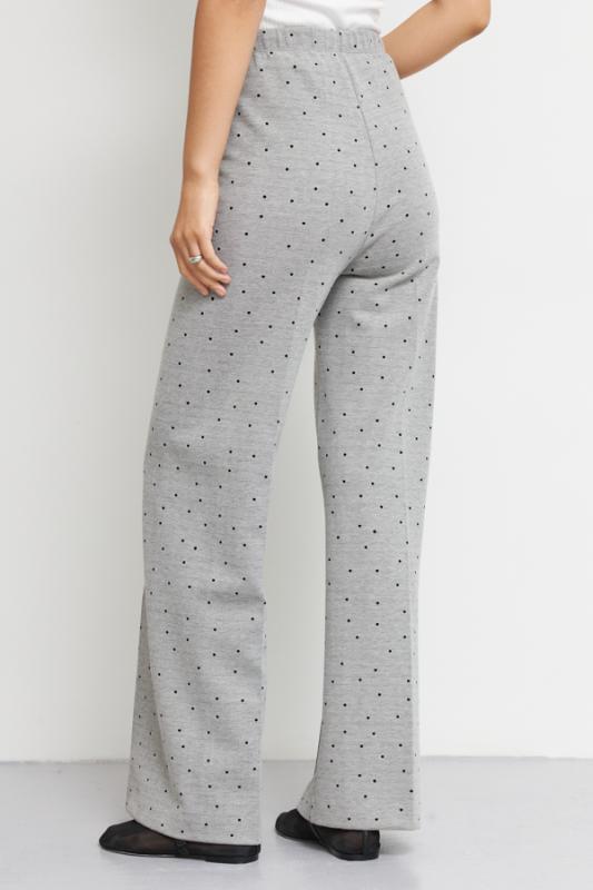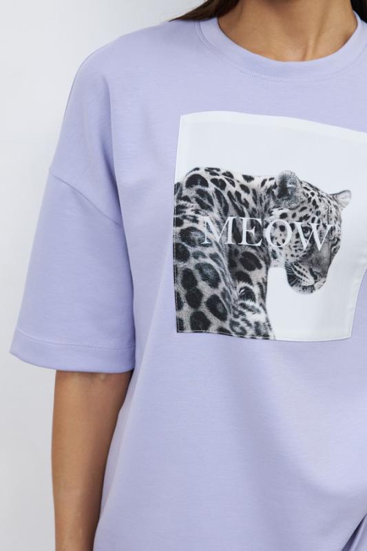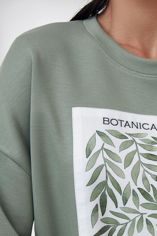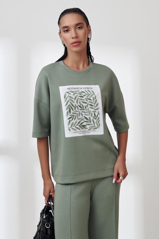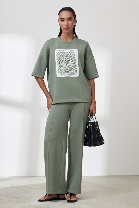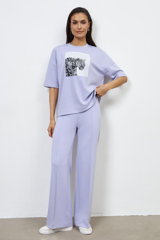Костюм из эластичного полотна. Джемпер свободного силуэта со спущенной линией плеча и рукавом до локтя. Вырез горловины оформлен бейкой из основной ткани. На передней части изделия выполнена аппликация. Брюки прямого силуэта. Пояс притачной с эластичной резиной. На передней части брюк застрочены стрелки.