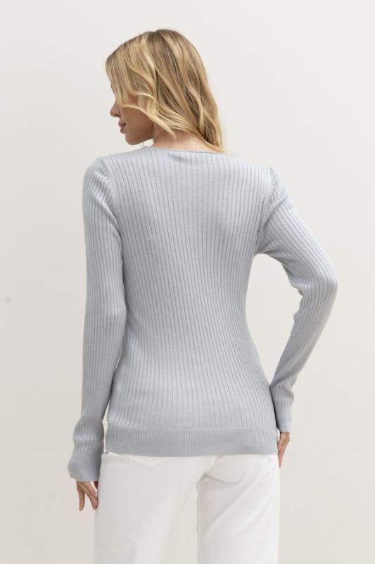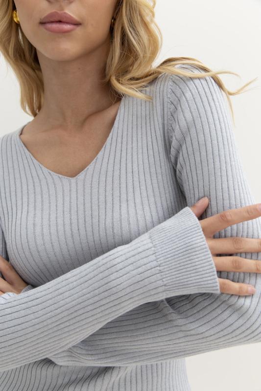 Джемпер полуприлегающего силуэта с рисунком в широкий рубчик. Длинный втачной рукав, V-образный вырез горловины. Низ изделия и низ рукава оформлены резинкой. Изделие выполнено из шелковистой вискозной пряжи.