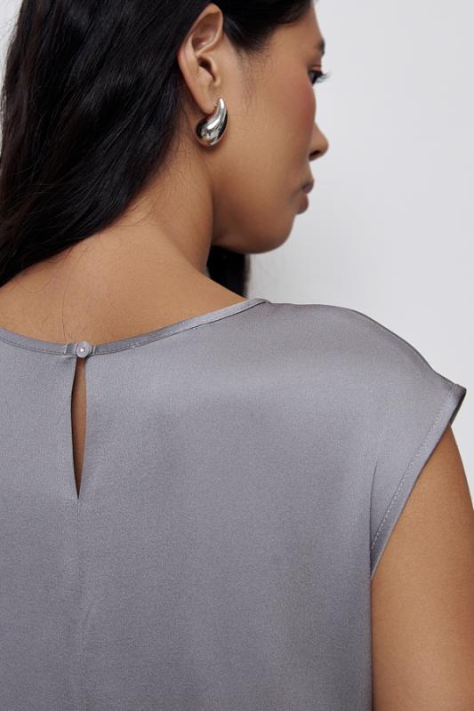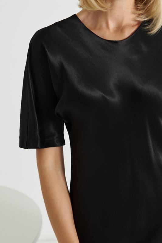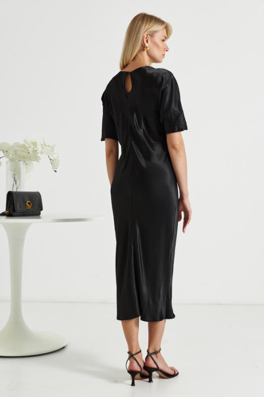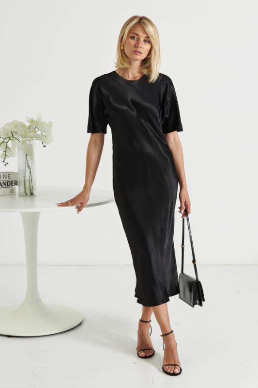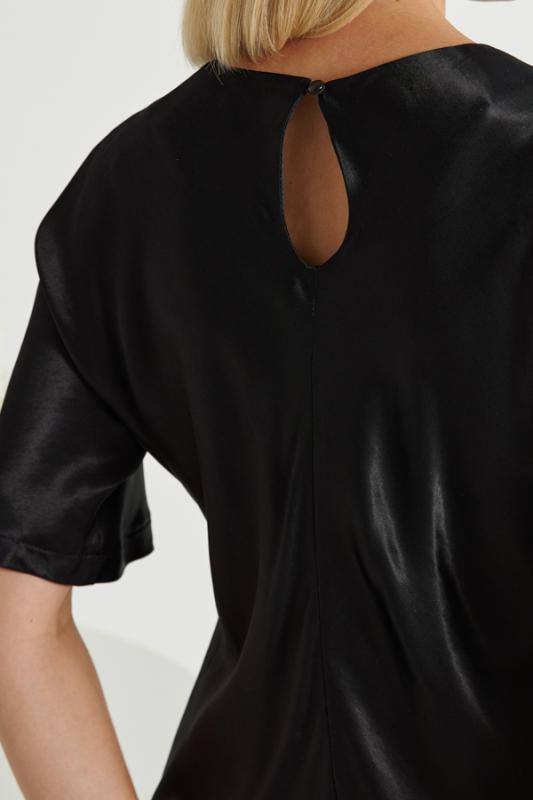 Платье прилегающего силуэта из вискозной ткани с сатиновым блеском. Крой платья по косой. Цельнокроеный короткий рукав. Круглый вырез горловины, сзади застёжка на петлю-пуговицу.
