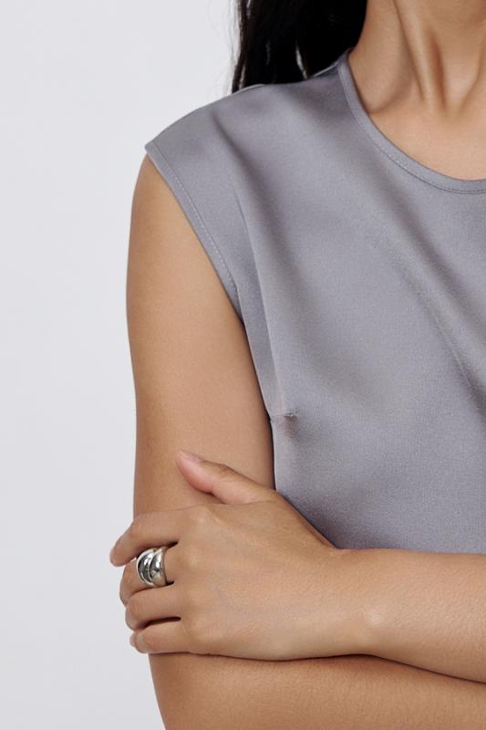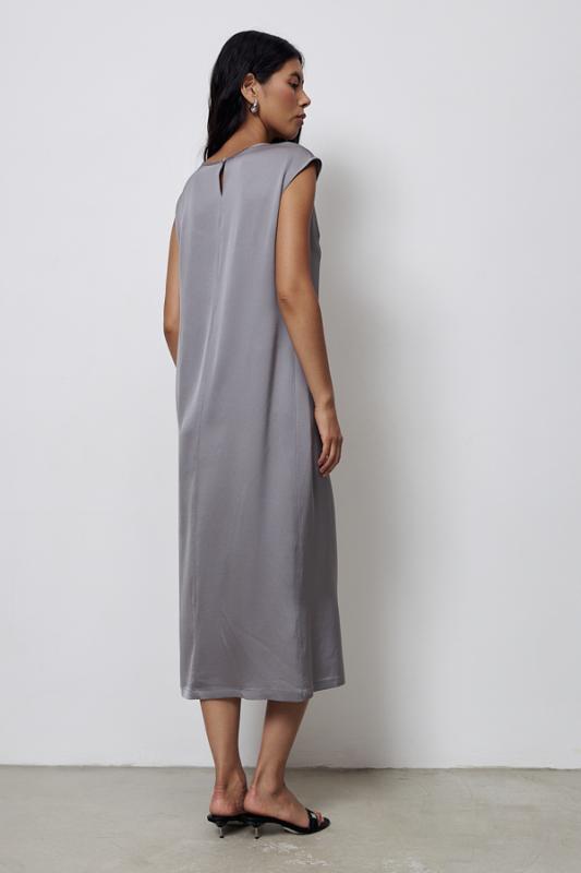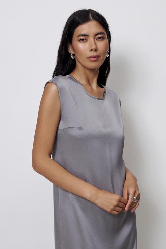 Платье из вискозной ткани с сатиновым блеском. Полуприлегающий силуэт, с разрезом в боковом шве. По среднему шву спинки застёжка на петлю-пуговицу. Круглый вырез горловины и линия проймы окантованы косыми бейками из основной ткани.