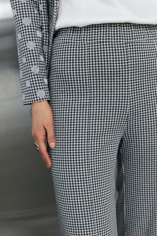. Брюки прилегающего силуэта. Пояс притачной с эластичной резиной. На передней части брюк застрочены стрелки. Жакет прямого силуэта с английским воротником, который визуально сделает фигуру стройнее и подчеркнет красивую линию груди. На передней части жакета застежка на пуговицу и накладные карманы. Втачной длинный рукав. Изделие с плечевыми накладками.