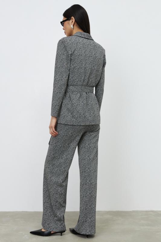 Костюм из эластичного полотна. Брюки прямого силуэта. Пояс с эластичной резиной. На передней части брюк застрочены стрелки. Жакет прямого свободного кроя с женственным шалевым воротником. На передней части изделия накладные карманы. Втачной рукав. В комплекте пояс из основной ткани, позволяющий создавать приталенный силуэт. Изделие с плечевыми накладками, которые при желании можно убрать.