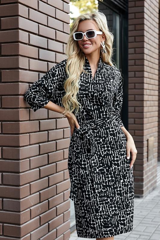 Платье из эластичного полотна с жаккардовым анималистичным узором. Изделие свободное в верхней части и прилегающее в области талии и бёдер. Лиф изделия оригинального кроя в стиле кимоно. Цельнокроеная стойка переходящая в запах, визуально делает фигуру стройнее. По центру задней части платья выполнен шов, снизу небольшой разрез. В комплекте пояс. В таблице размеров представлены параметры человека, а не изделия.