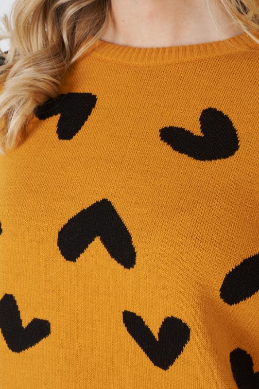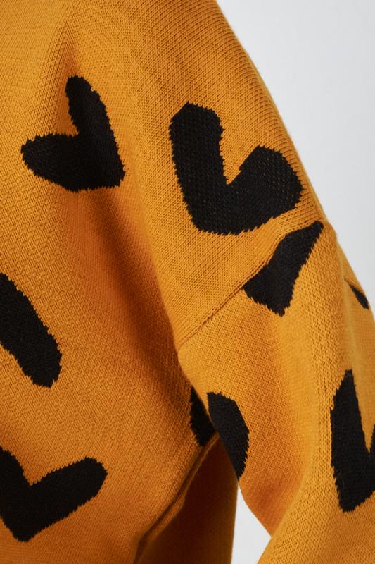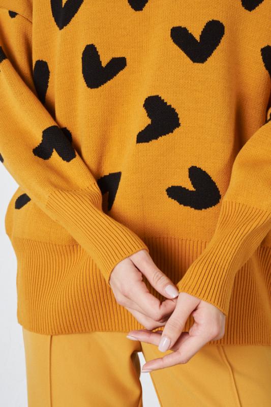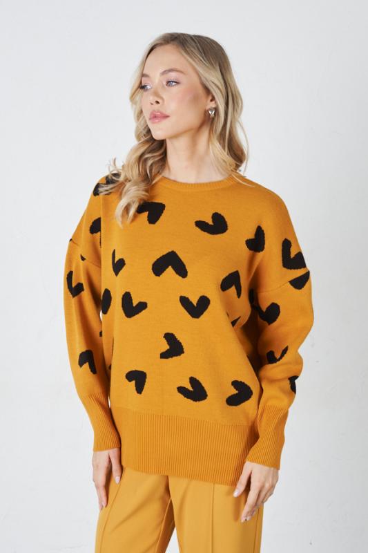 Джемпер свободного силуэта с узором «сердечки» на передней части. Изделие со спущенной линией плеча и длинным рукавом. Низ изделия и низ рукава с высокой резинкой. Круглый вырез горловины оформлен резинкой-бейкой. Изделие выполнено из мягкой структурированной пряжи.