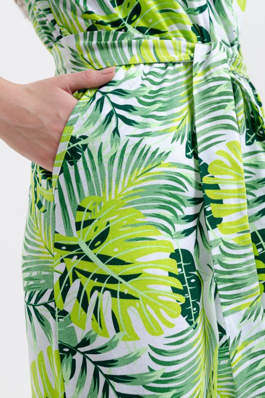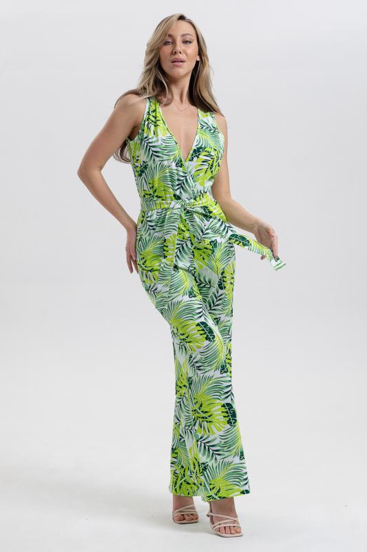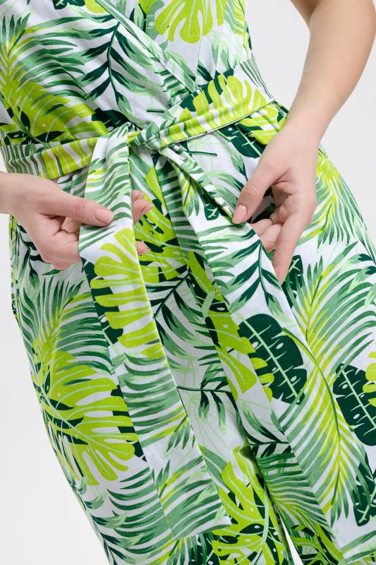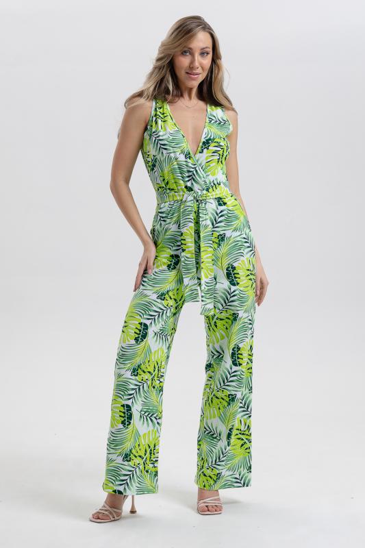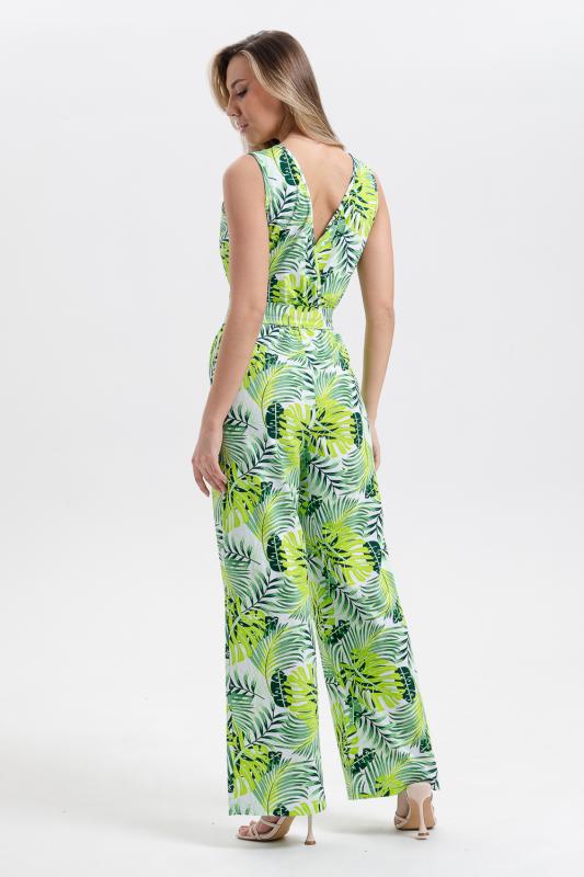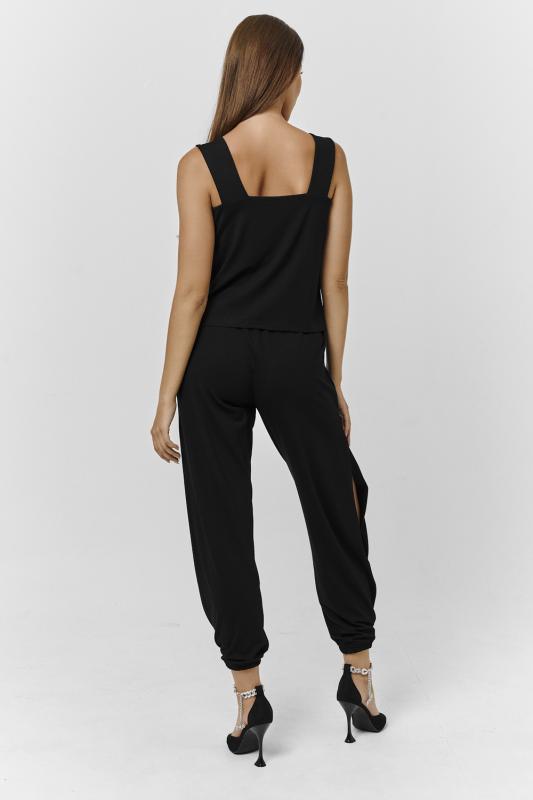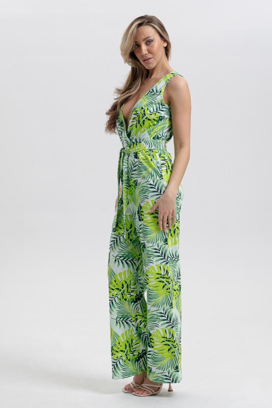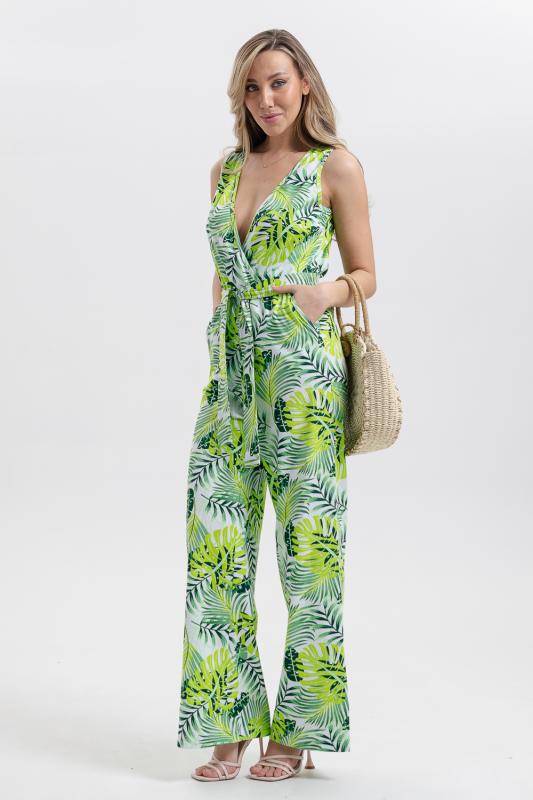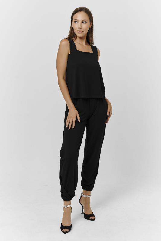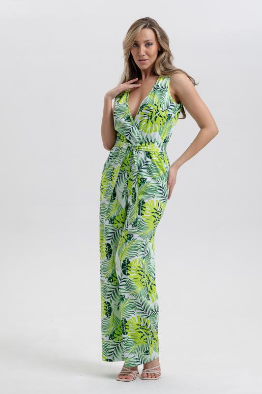 Стильный и универсальный элемент летней одежды - комбинезон с брюками. Верх комбинезона соединён с брюками, тем самым создаётся непрерывный образ сверху вниз, визуально удлиняя фигуру. Передняя и задняя части верха комбинезона состоят из двух отдельных элементов, которые соединены на запах, образуя элегантный V-образный вырез. По линии талии вшита резинка, а в комплекте есть пояс. Брюки свободные, прямые с боковыми карманами.