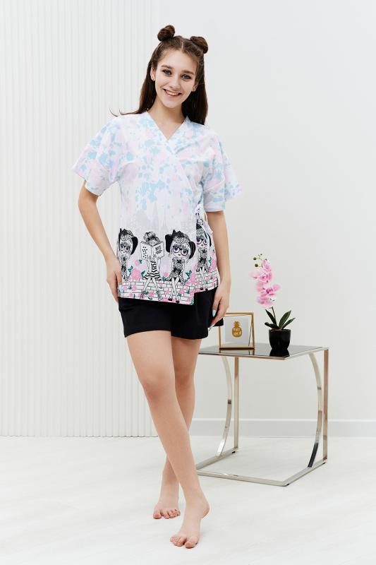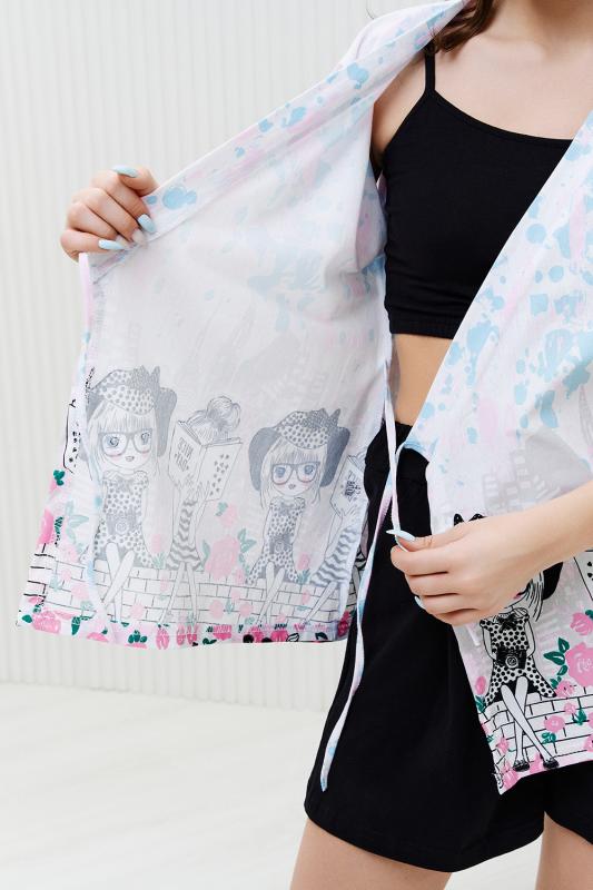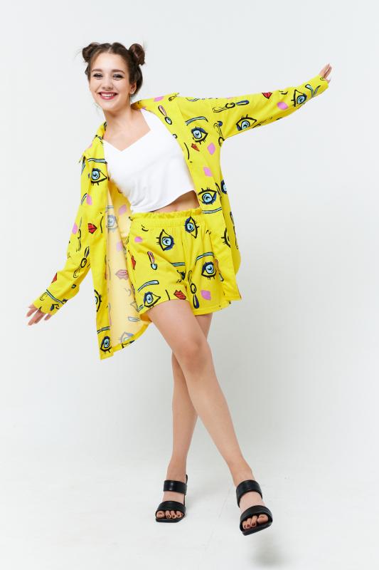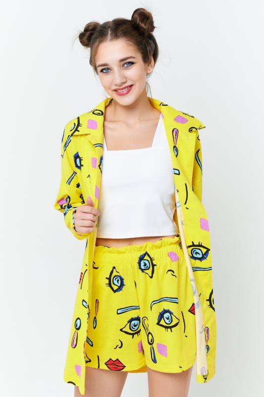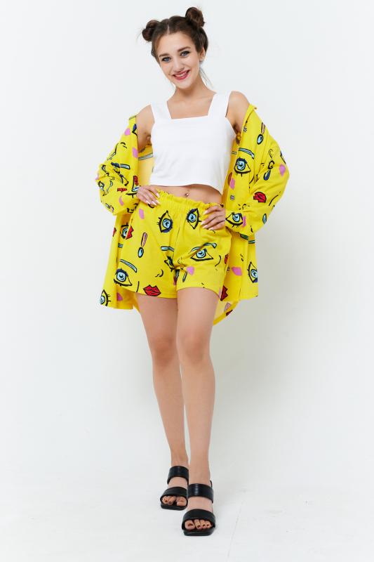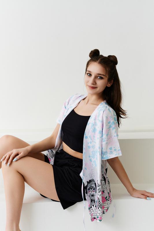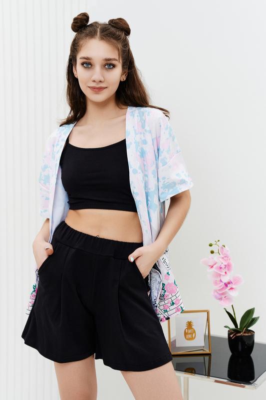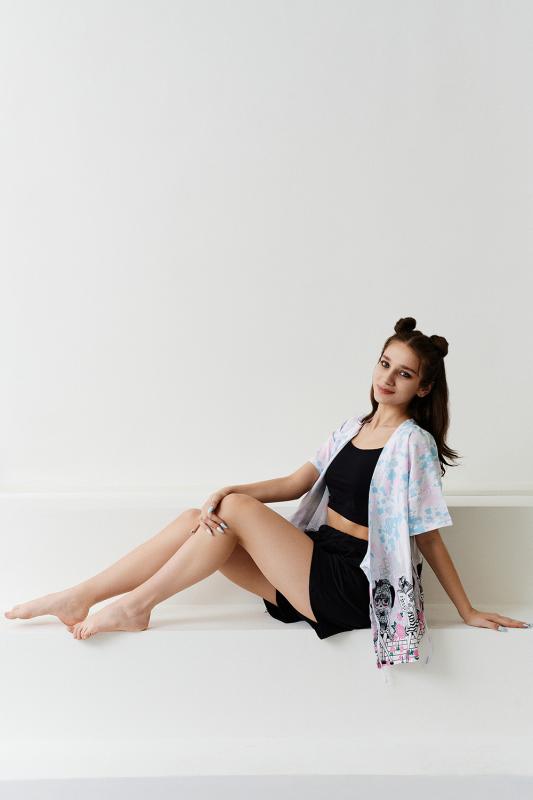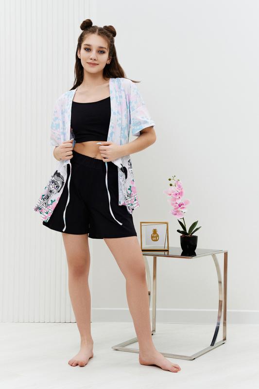 Комплект состоит из топа, шорт и короткого кимоно. Топ из эластичного полотна, на тонких бретелях, длиной выше линии талии, с резинкой по низу. Горловина и бретели топа обработаны бейкой из основного полотна. Шорты из кулирки с лайкрой на поясе, с боковыми карманами. В верхней части передних половинок по шву притачивания пояса расположены складки. Кимоно выполнено из отделочн