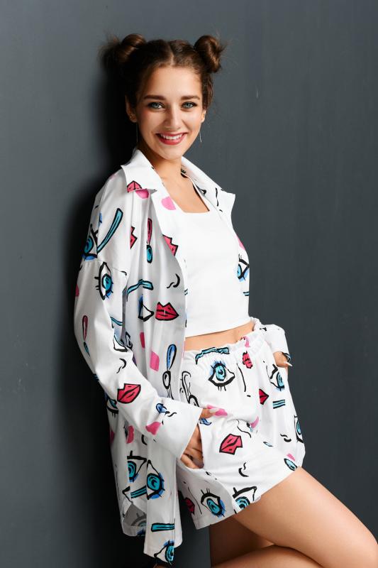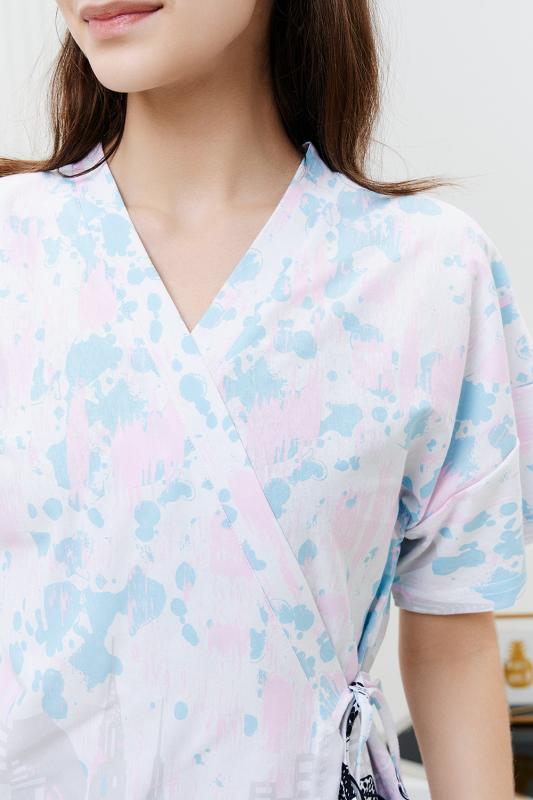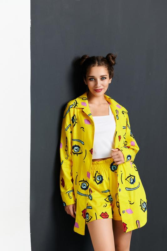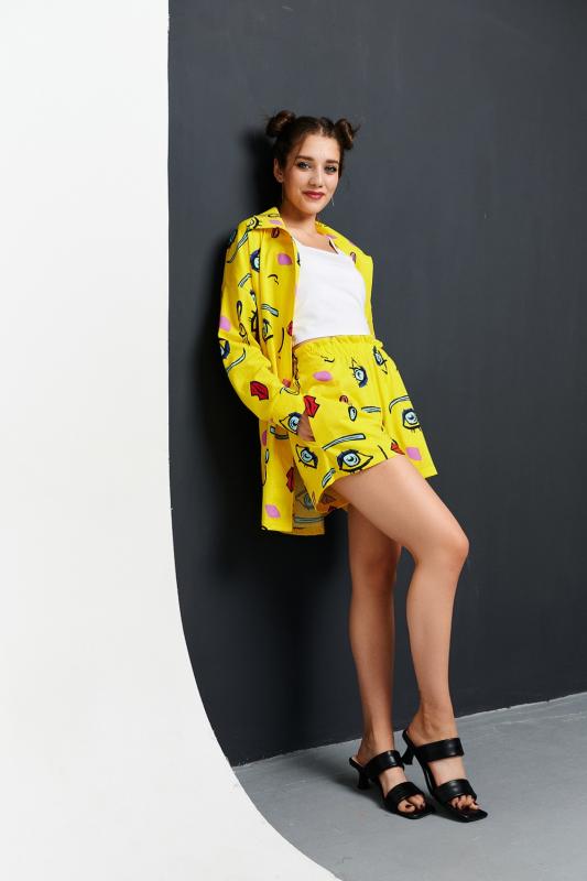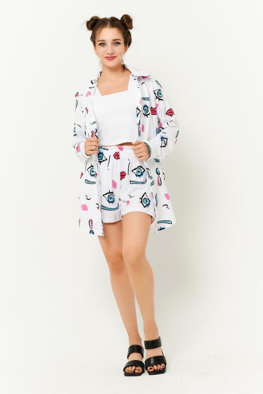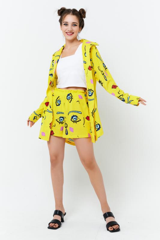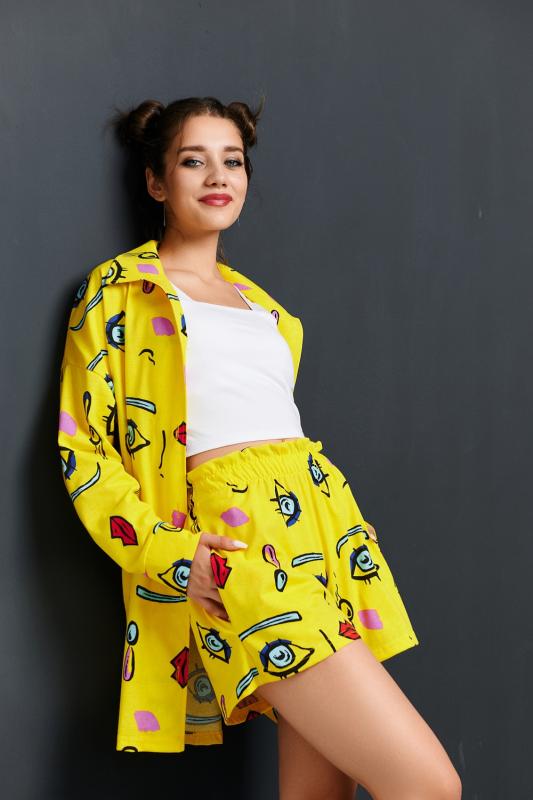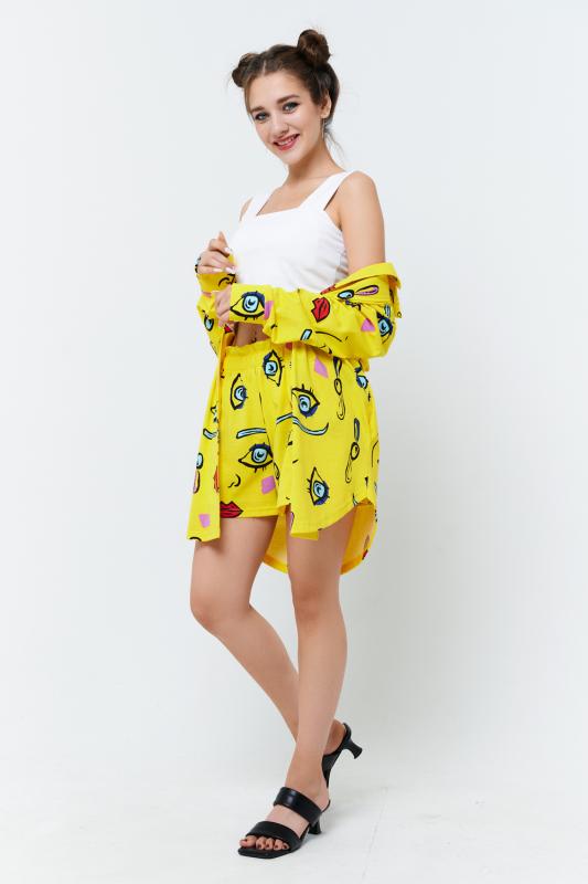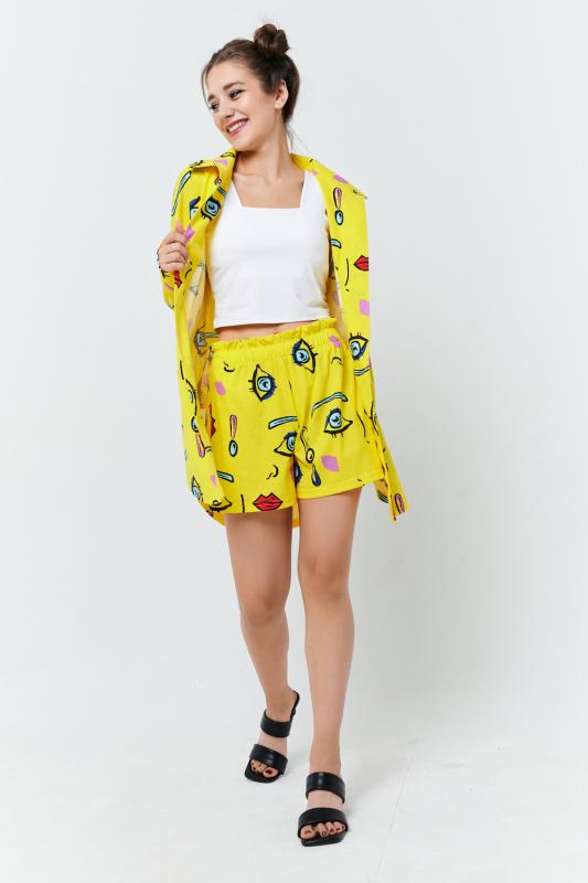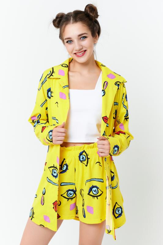 Комплект состоит из топа, шорт и короткого кимоно. Топ из эластичного полотна, на тонких бретелях, длиной выше линии талии, с резинкой по низу. Горловина и бретели топа обработаны бейкой из основного полотна. Шорты из кулирки с лайкрой на поясе, с боковыми карманами. В верхней части передних половинок по шву притачивания пояса расположены складки. Кимоно выполнено из отделочн