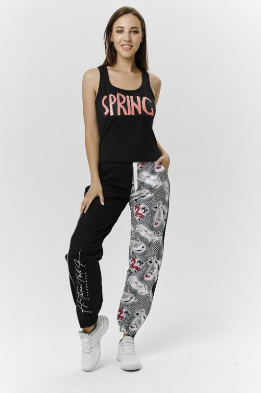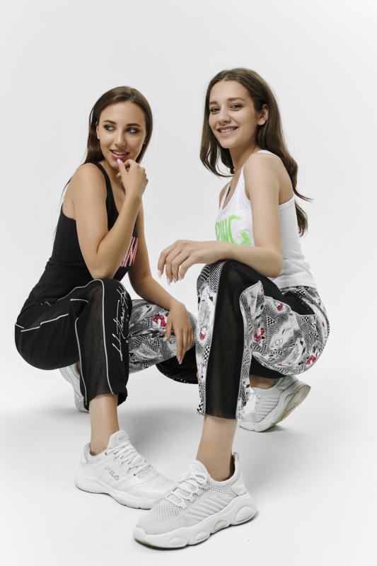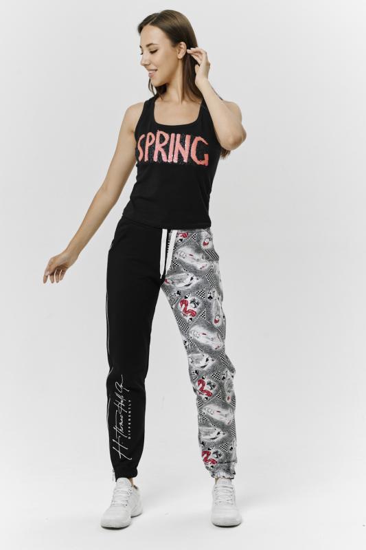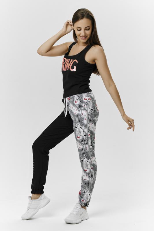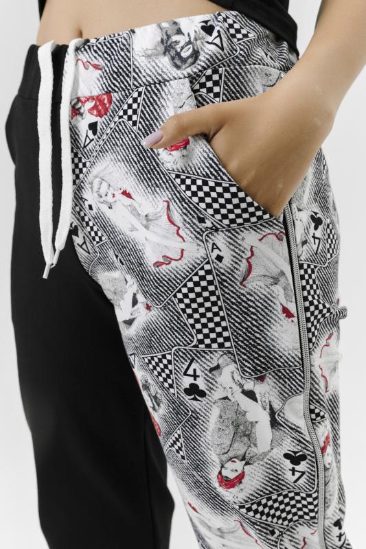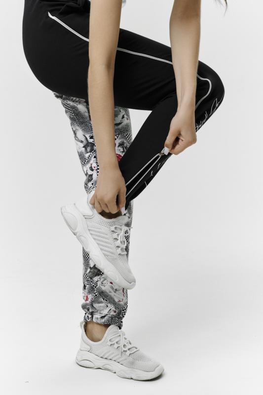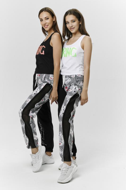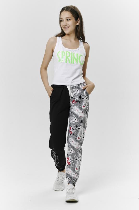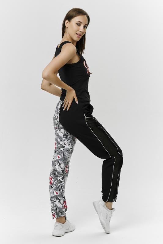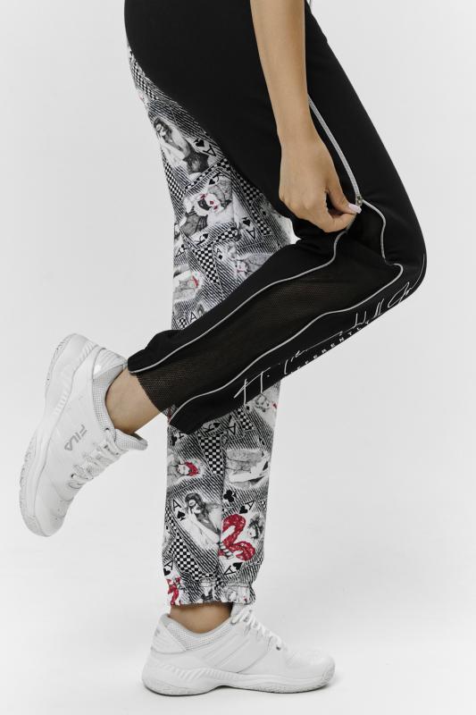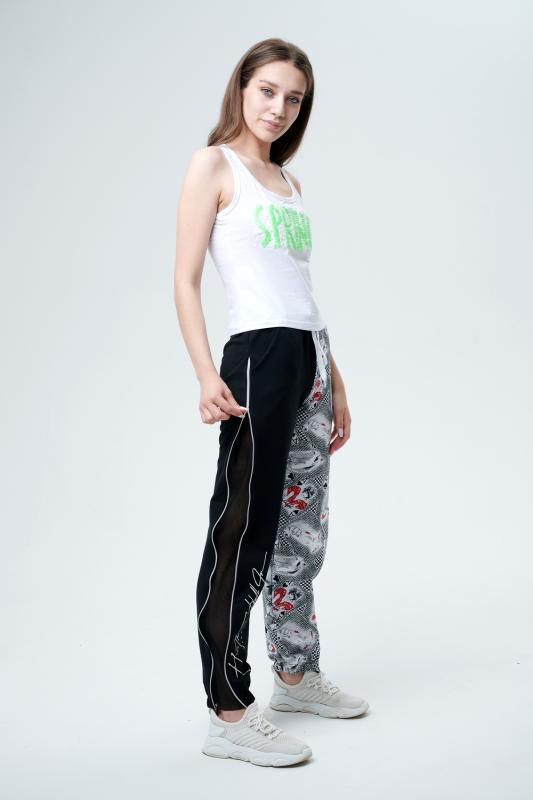 Брюки молодежные выполнены в технике COLOR BLOCKING с сеткой и молниями в боковых швах, на правой передней половинке брюк модный принт. Низ брюк собран на широкую резинку.