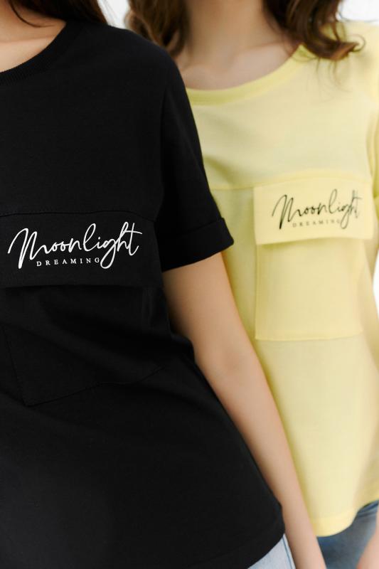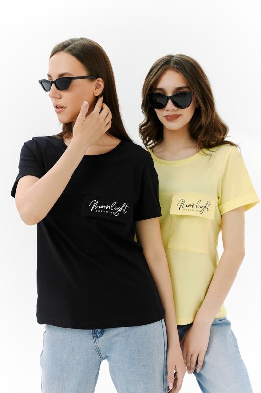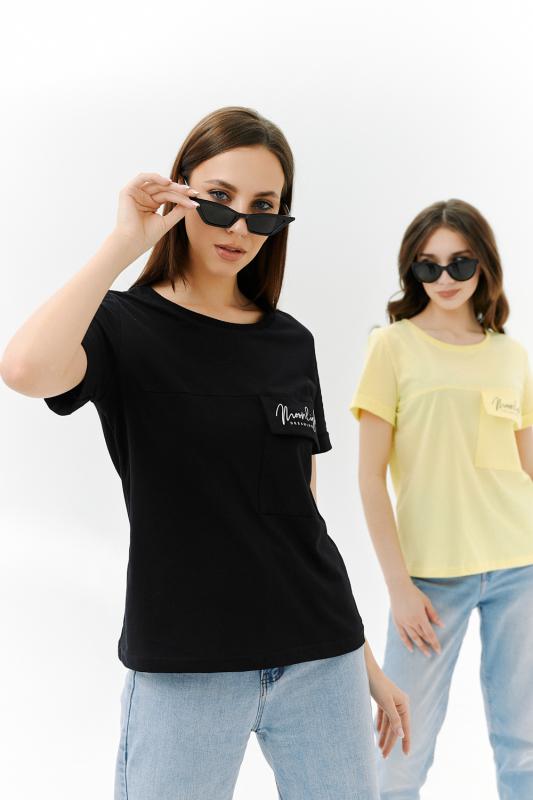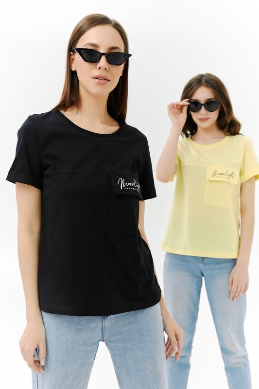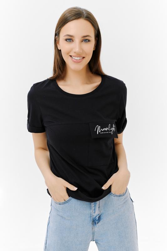Футболка прямого силуэта, с округлой горловиной, длиной до середины бедра. Рукав втачной, короткий, с отворотом. На полочке расположен накладной карман с клапаном. Горловина обработана обтачкой из эластичного полотна.