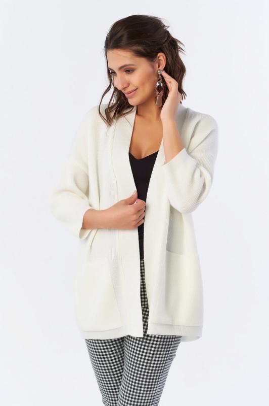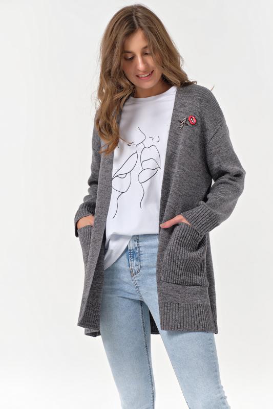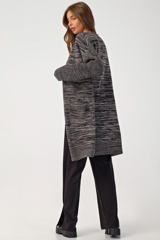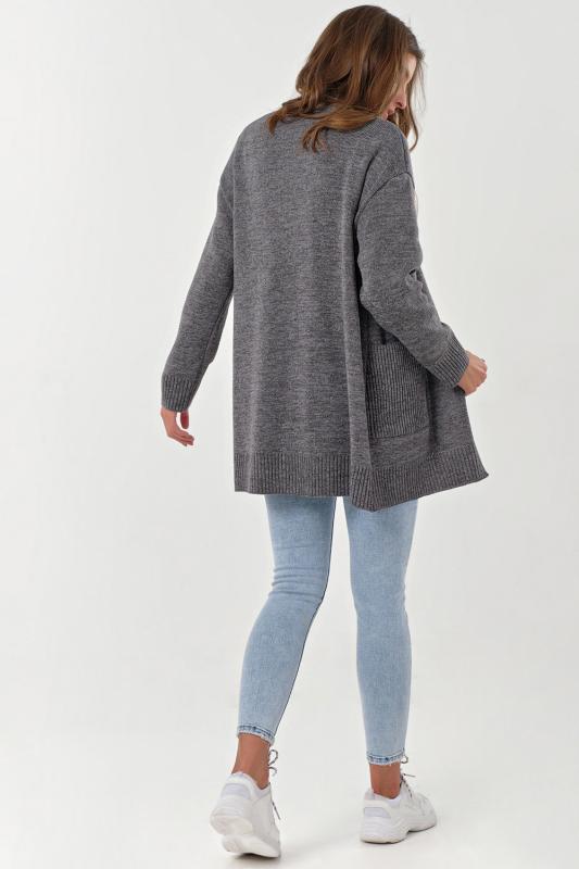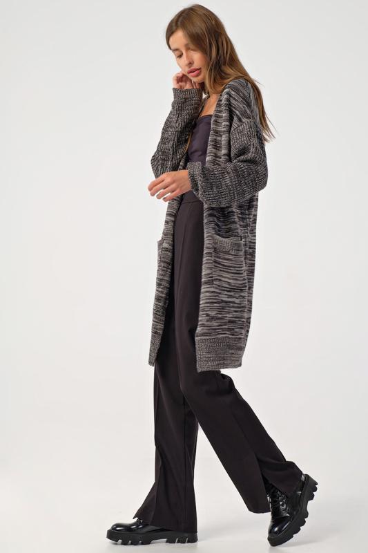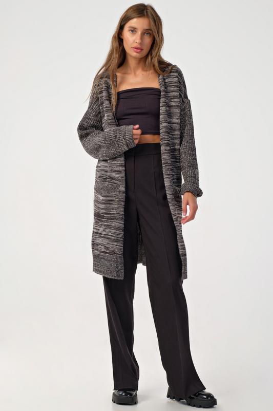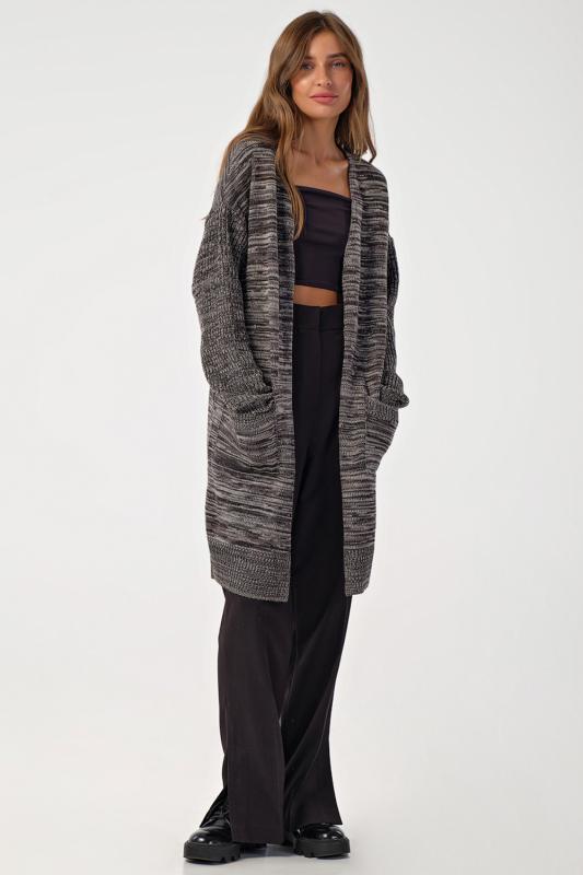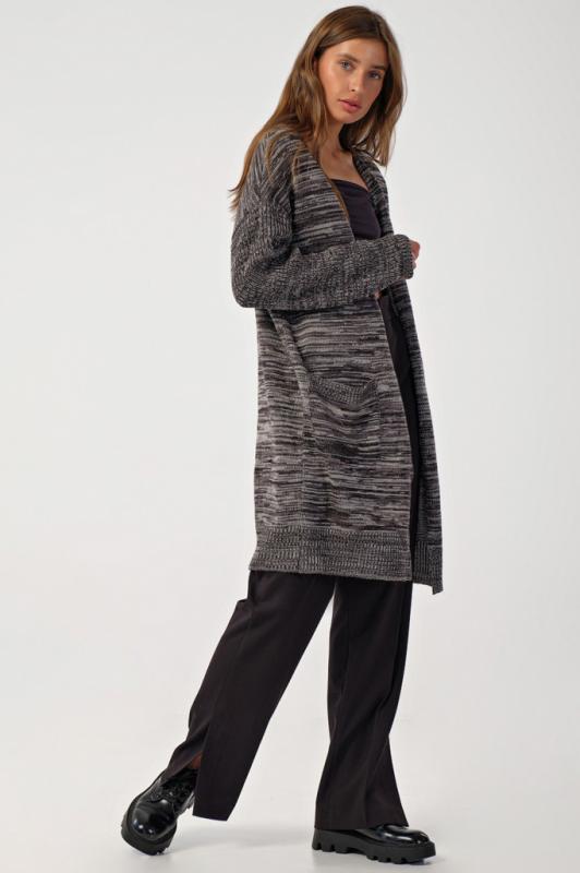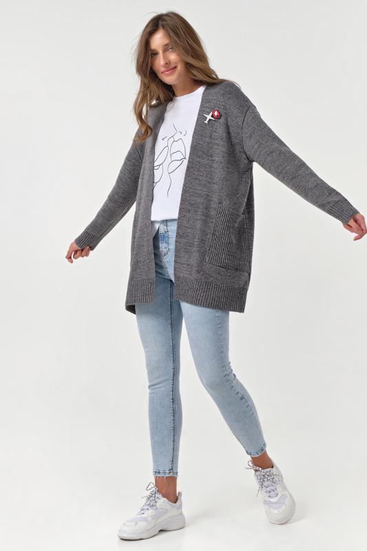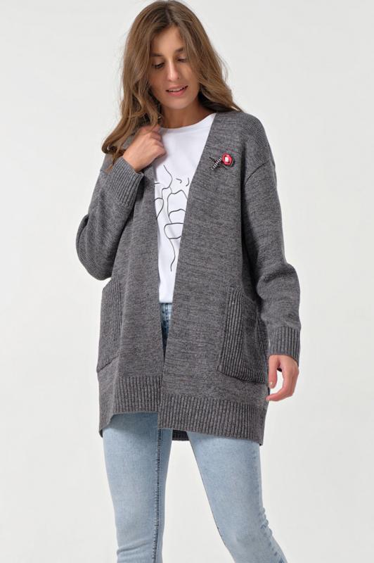 Особенности: Мягкий кардиган из смесовой пряжи с деликатным меланжем. Низ изделия, рукава и карманы оформлены фактурной резинкой. По переду декоративные съемные элементы.