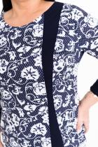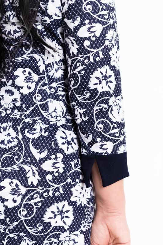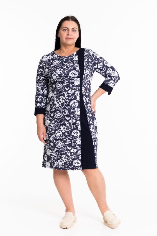 Женское платье выполнено из полотна академик. Горловина имеет круглый вырез, рукава длинные. В качестве отделки однотонные вставки из отделочного полотна.