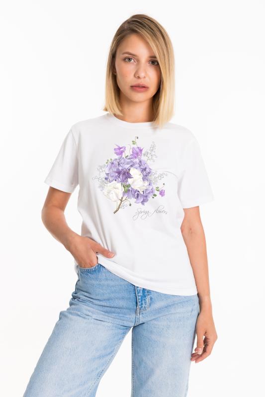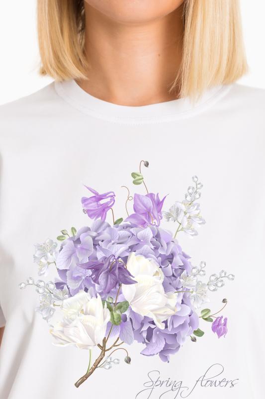 Футболка из однотонной кулирки с добавлением лайкры. С коротким рукавом и притачной планкой по горловине. Спереди нанесён принт.
