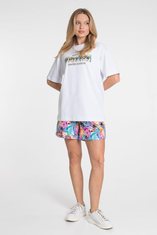 Женский костюм — отличный выбор для жаркой погоды. Он состоит из свободных шорт и футболки, выполненных из лёгких и приятных к телу материалов. Футболка из однотонной кулирки свободного силуэта придаёт изделию комфорт и удобство. На передней части расположен принт, который гармонично сочетается с цветом шорт и добавляет яркости модели. Шорты изготовлены из футера с добавлением лайкры, что обеспечивает эластичность и свободу движений. Пояс на резинке и шнур позволяет регулировать посадку, а боковые карманы — хранить мелочи под рукой. Такой костюм идеально подойдёт для прогулок, отдыха на пляже или неформальных мероприятий.