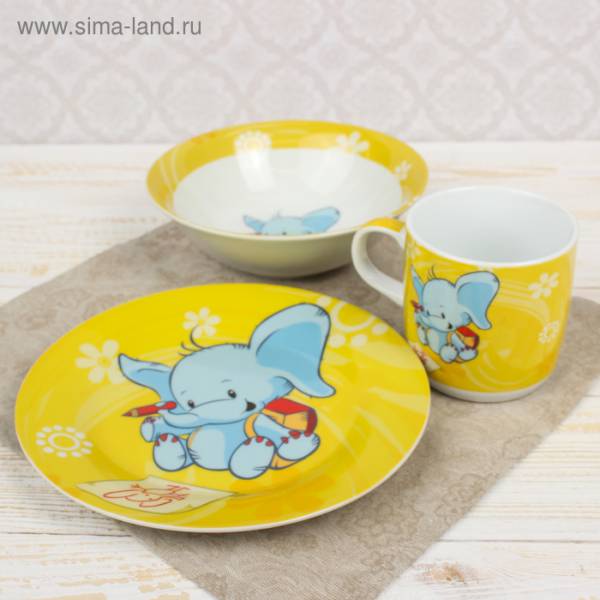 Набор детской посуды "Слоненок", 3 предмета: кружка 230 мл, миска 400 мл, тарелка 18 см