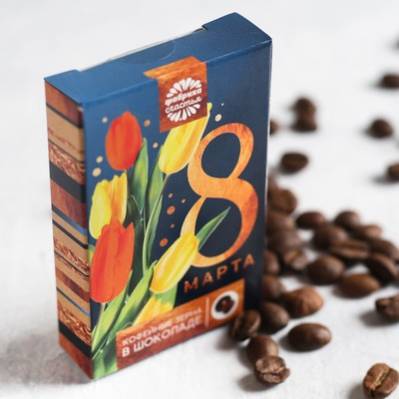 Кофейные зёрна в шоколаде в коробке "8 Марта" тюльпаны