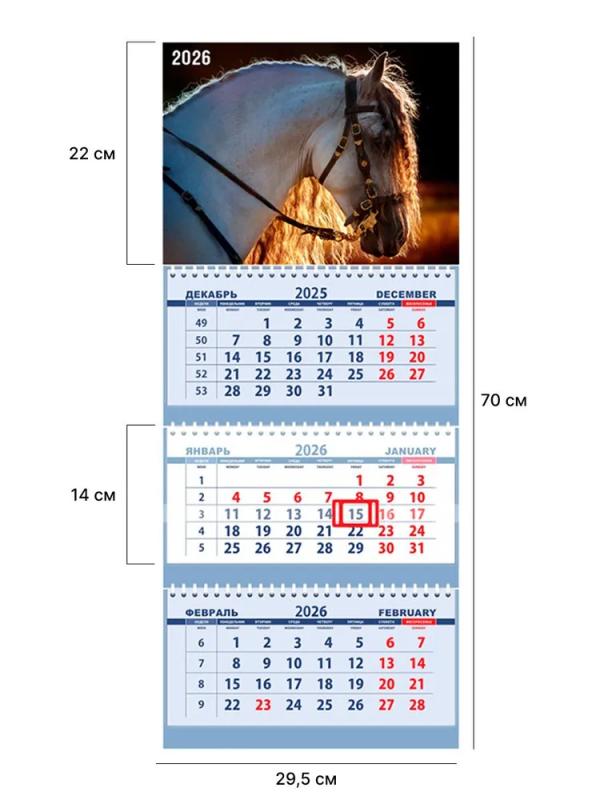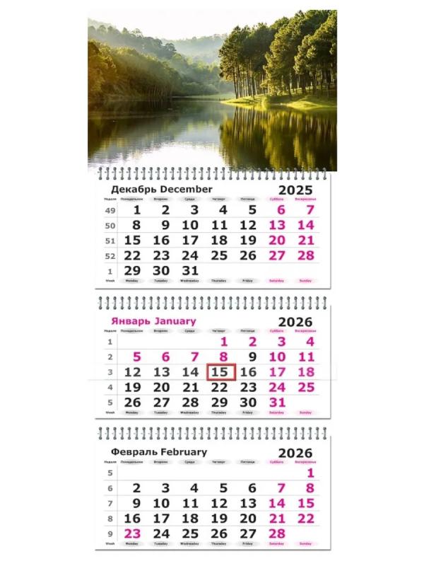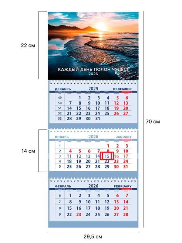 Трехблочный календарь (трио). Полноцветные численники. Шапка: картон 250 г/м, лак, 295х220мм. Размер в развернутом виде 295х730мм.