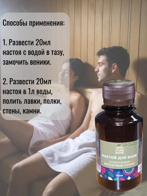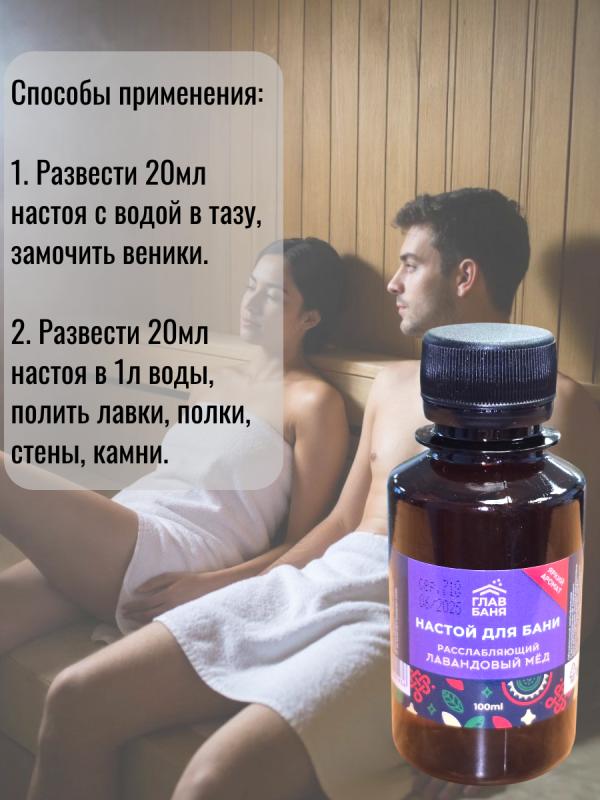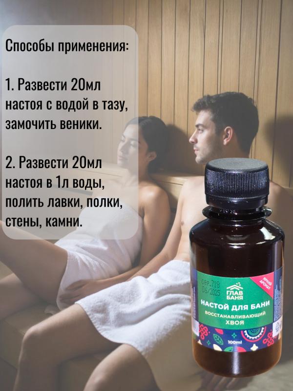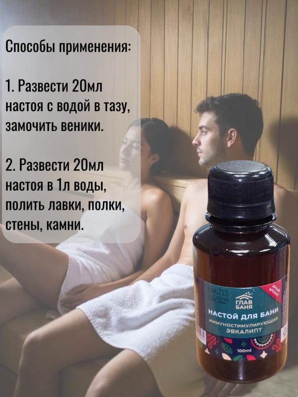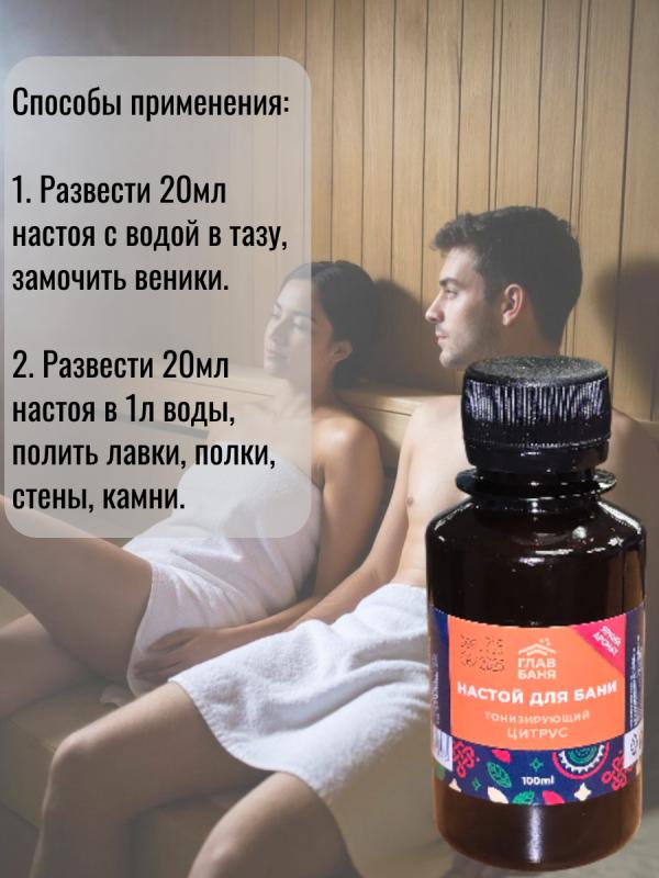 оказывает мощный оздоровительный и тонизирующий эффект.Разведите 5-10 мл настоя в литре воды, полейте получившимся раствором стены и полки парной, подайте на раскаленные камни или замочите в нем веник.Воздух парной наполнится приятным ароматом и полезными микроэлементами.Настои в бане используются еще с давних времен. Они позволяют сделать посещение бани не только приятным, но и полезным ритуалом.Воздух, обогащенный полезными веществами, благоприятно влияет не только на настроение и самочувствие, но и на кожу и волосы.